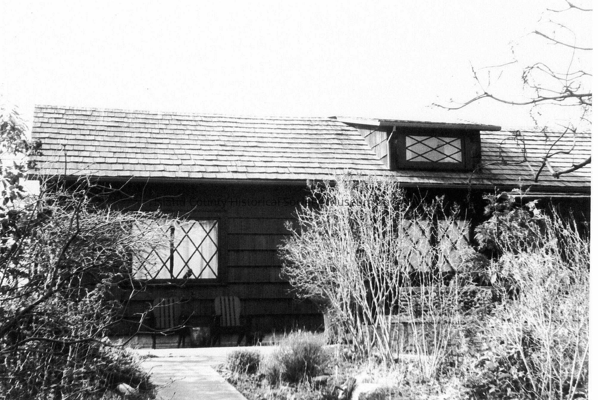 Black & white photo of the Fullington House. No date. The view is of the left side of the front of the house. The house is sided in cedar shakes with a wood shingled roof. It has one small dormer window on the roof which is above a double window on the ground floor. There is another double window on the left saide of the ground floor. All of the windows have diamond pane insets. The front yard is planted with many shrubs and plants.