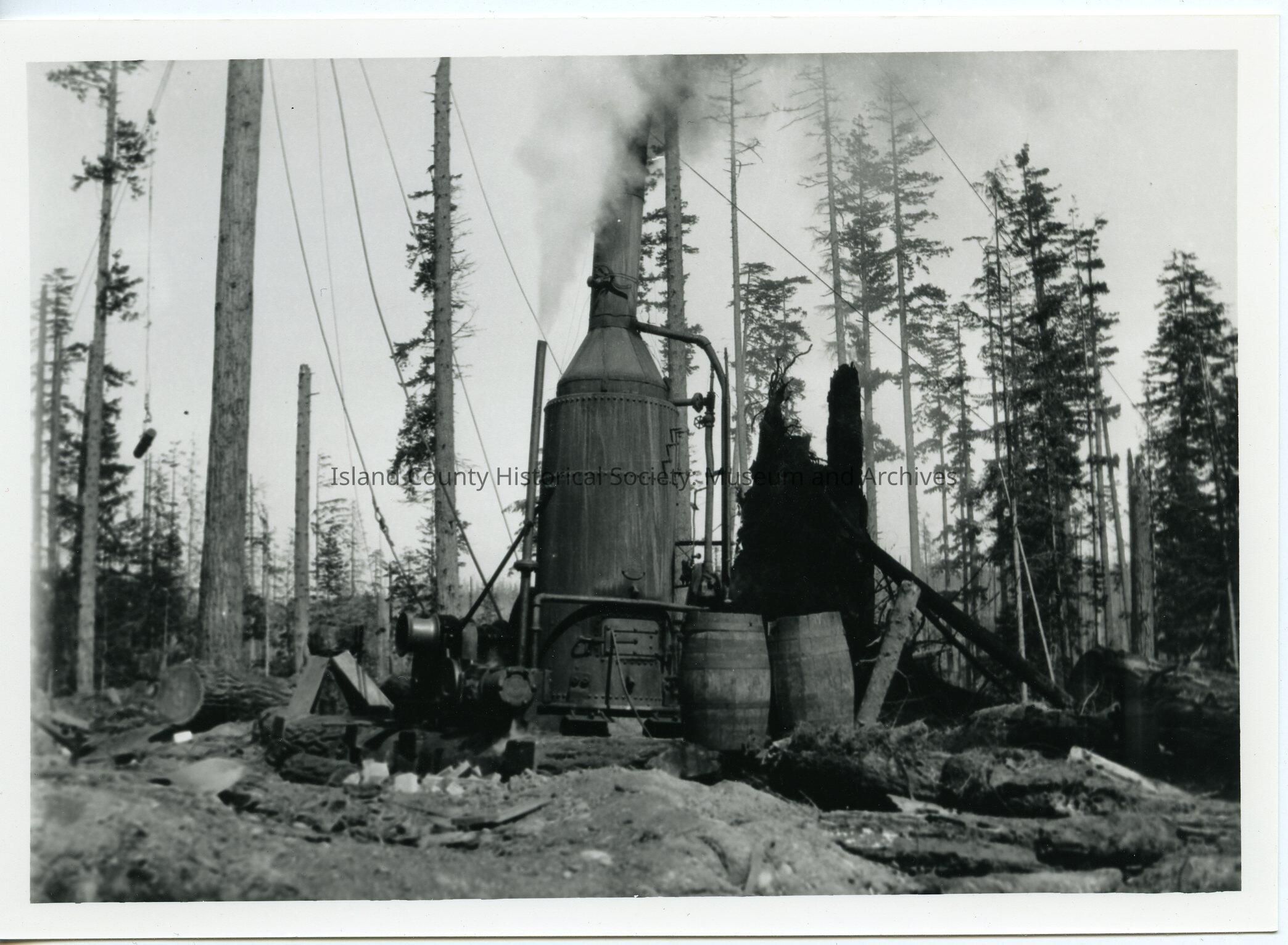 Black and white photo of a donkey engine at a logging camp. Barrels are next to it. On the back: "Steam donkey 1924"
