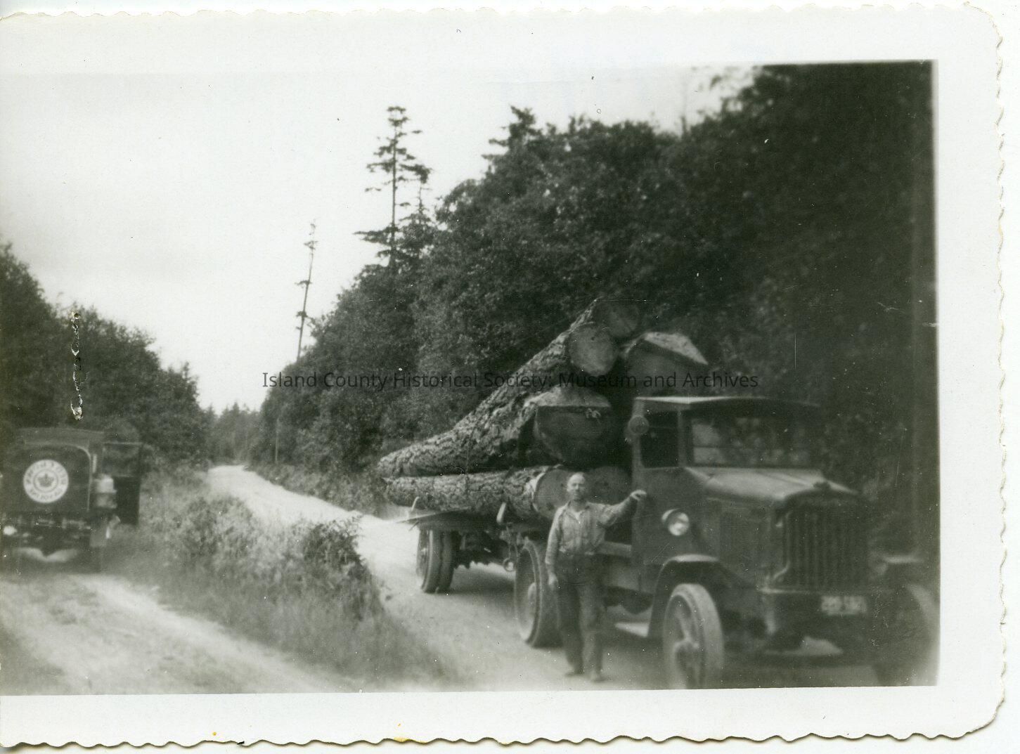 Black and white photo of a man beside a logging truck on a dirt road. Another vehicle is facing away on the other side; a sign on the back says (word -can't make out) Gasoline. (The reverse image of larger photo).