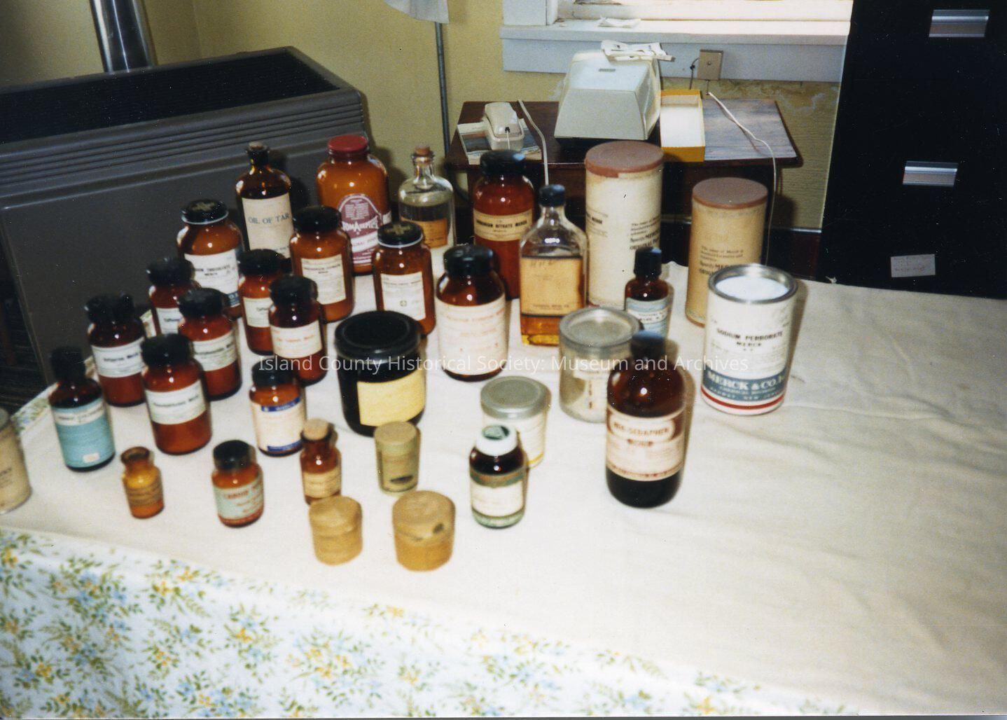A color photo of a table top with glass bottles and other containers (medicine?). Toward the back is a file cabinet, the bottom of a window, with a small table under it, and what looks like a heater? or refridgerator? on the left.
