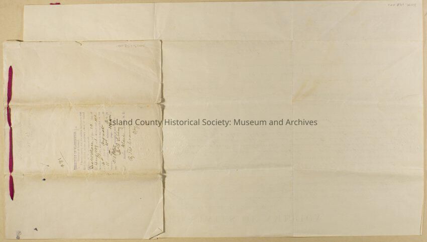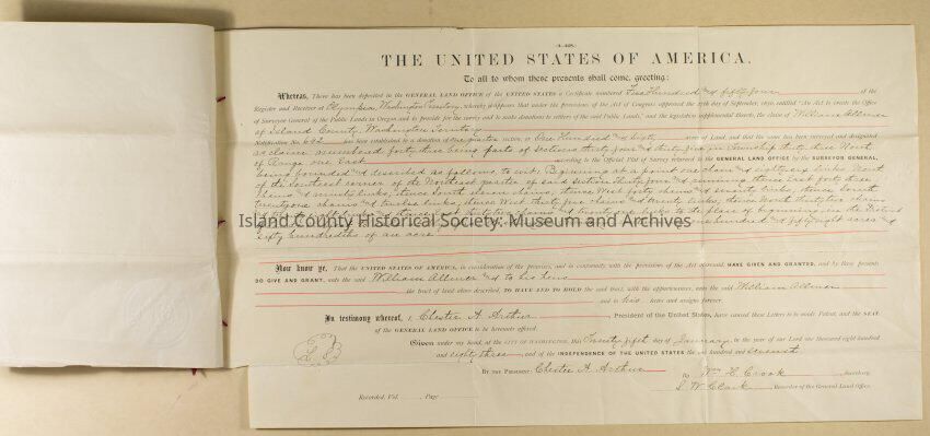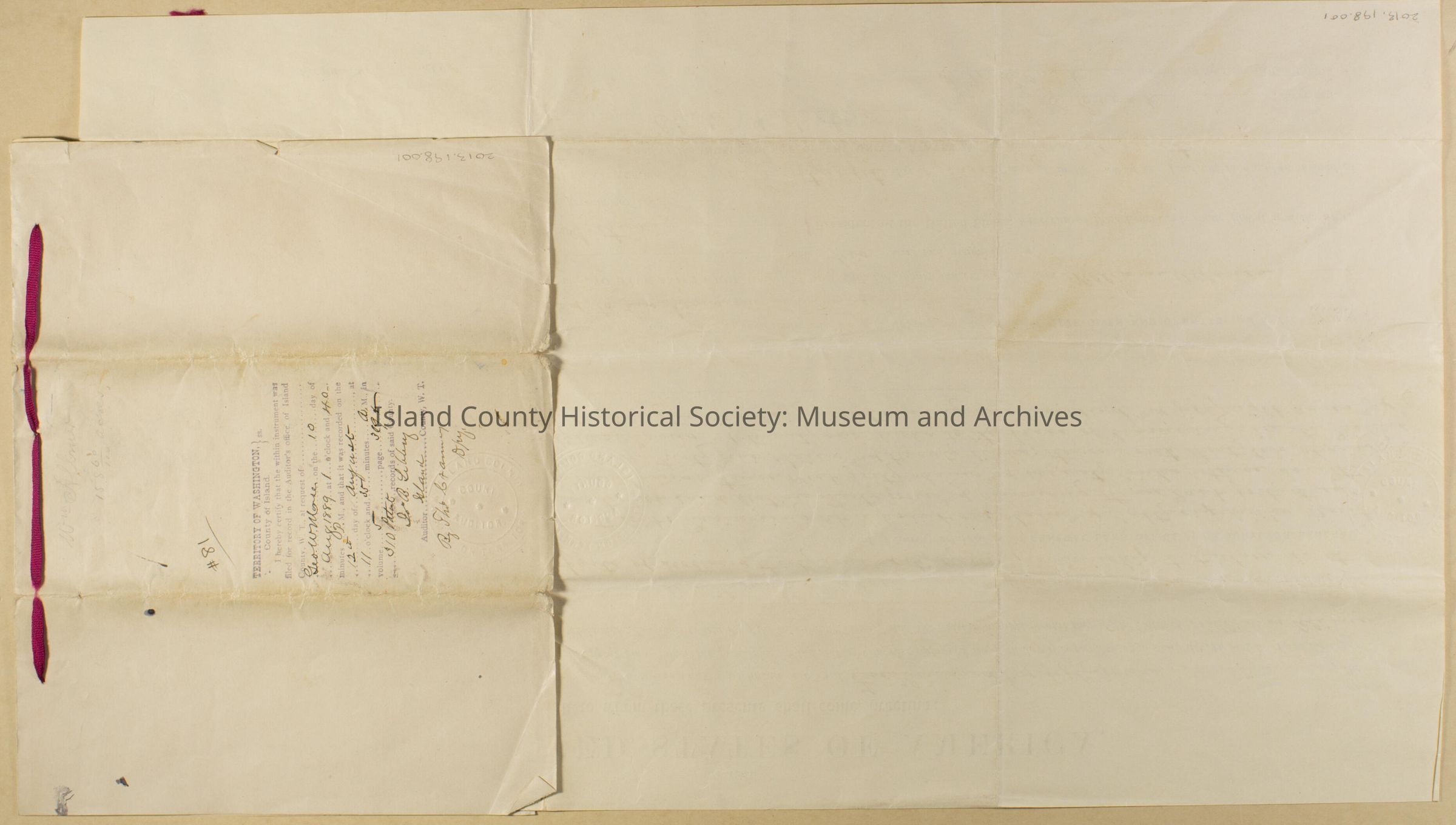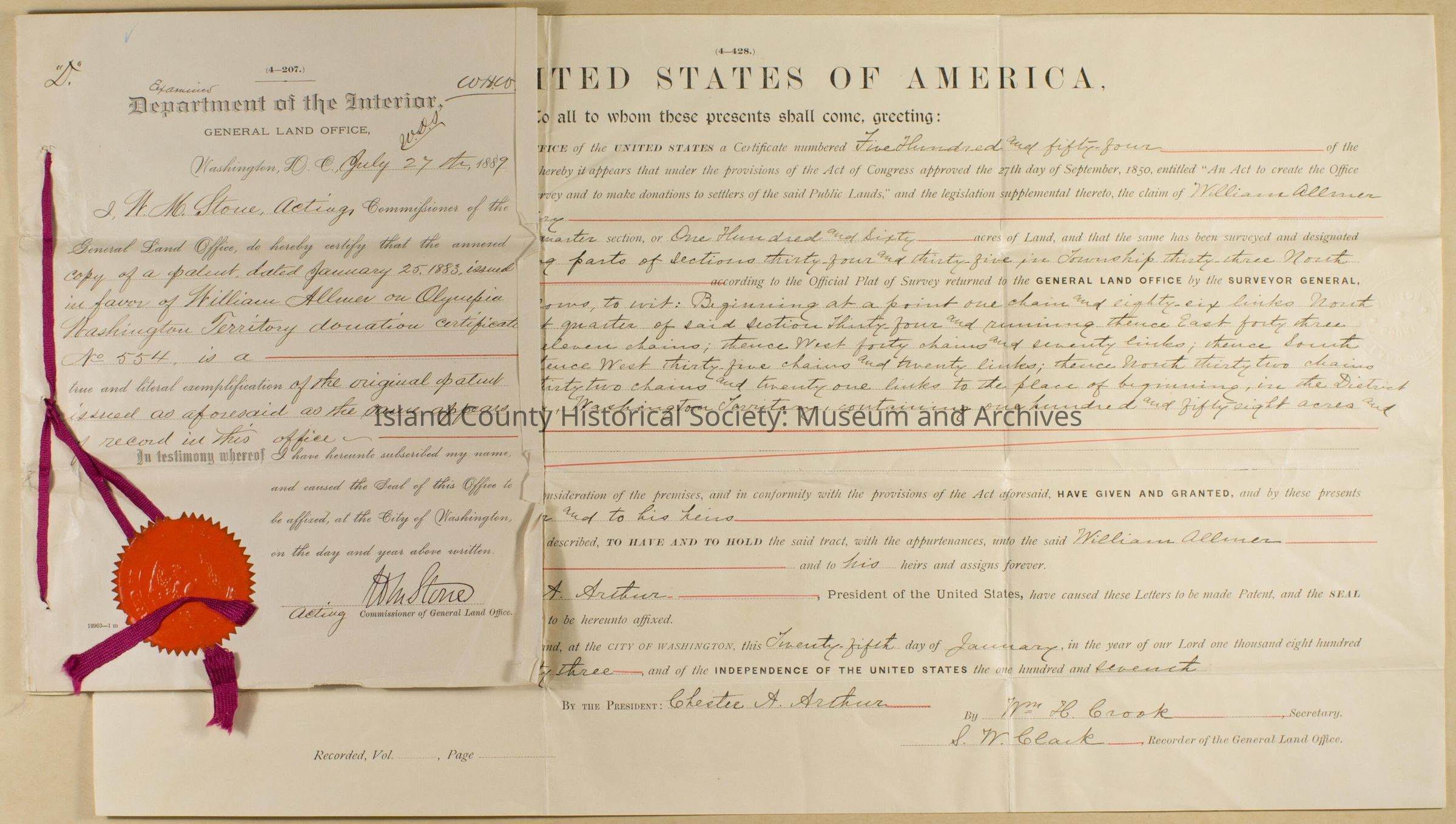 Land grant claim certificate, William Allmer, 1883/1889 Front a & b and back of certificate.