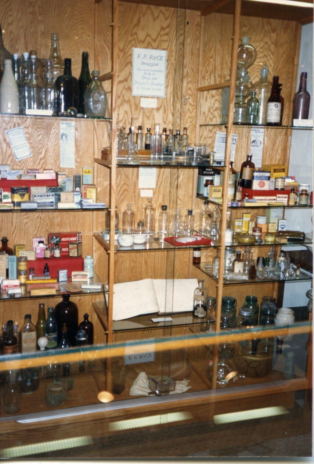 A color photo of a tall wooden case with glass shelfs holding many (meidcine?) bottles. A white sign at the top says "F. P. Race, Druggist, (and other words below that). Handwritten on the back is "L. Bottle Case. 1989."