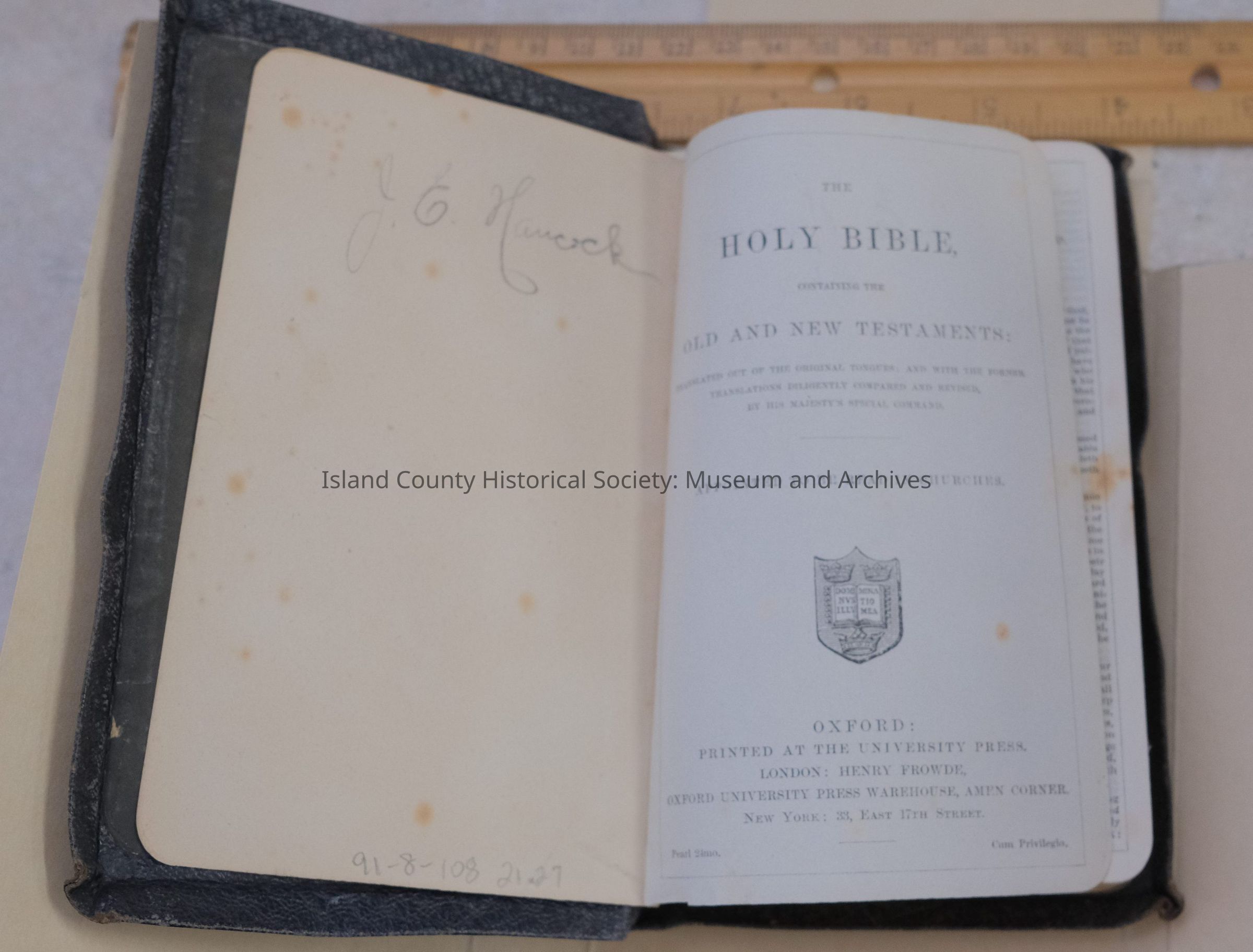 Holy Bible, University Press, New York, (no date). (Inscription: J.E. Hancock) 91-8-108 21.27