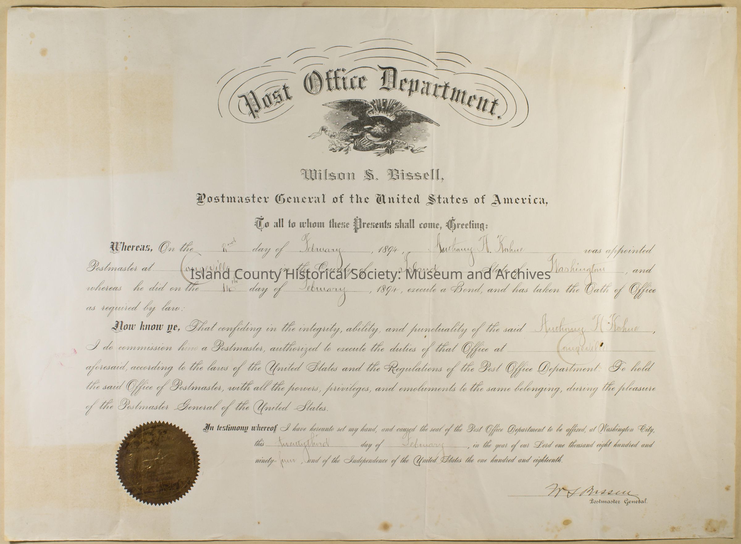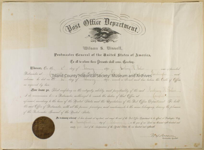 Anthony Kohne, postmaster of Coupeville, Certificate, 1894