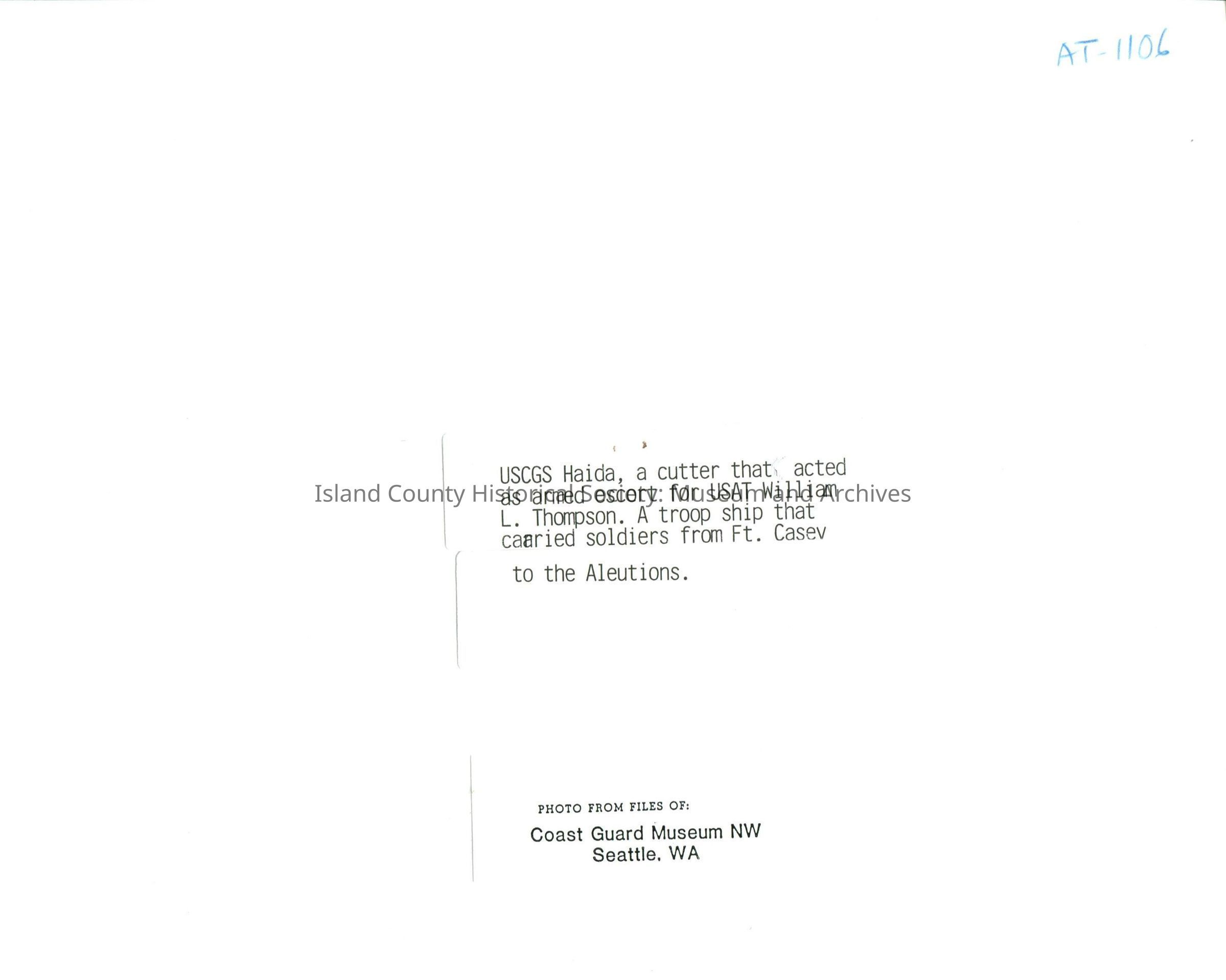 A black and white photo of a ship in the water. There are about 15 people visible on the ship. There is an American flag being flown. There are also two lifeboats visible on the ship. The back of the photo has a sticker on it that says, " USCGS Haida, a cutter that acted as armed escort for USAT William L. Thompson. A troop ship that carried soldiers from Ft. Casey to the Aleutions".