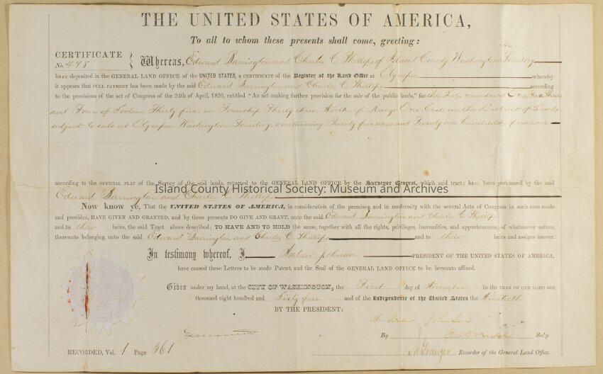 Certificate land grant claim, Edward Barrington and Charles Phillips; 1865