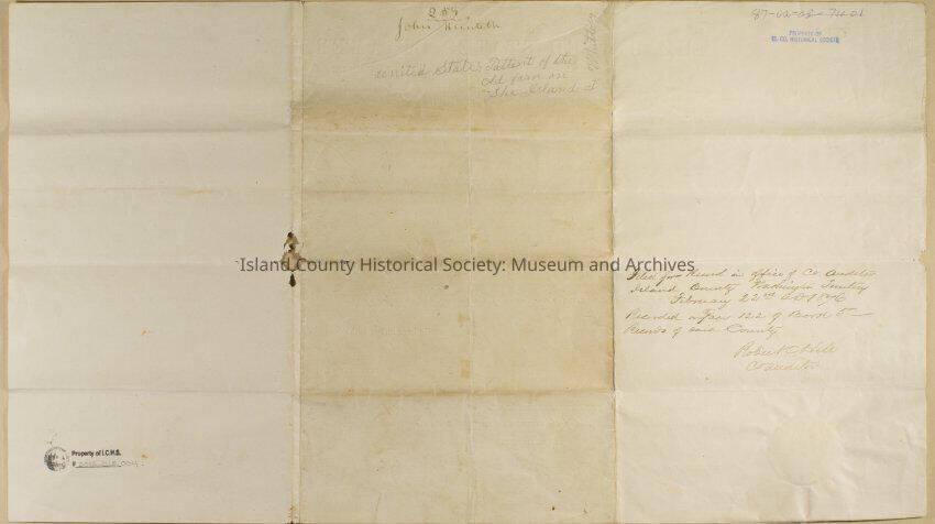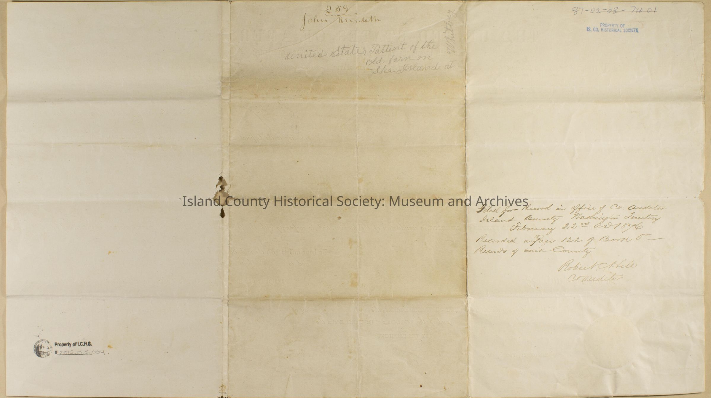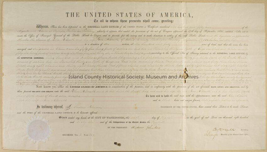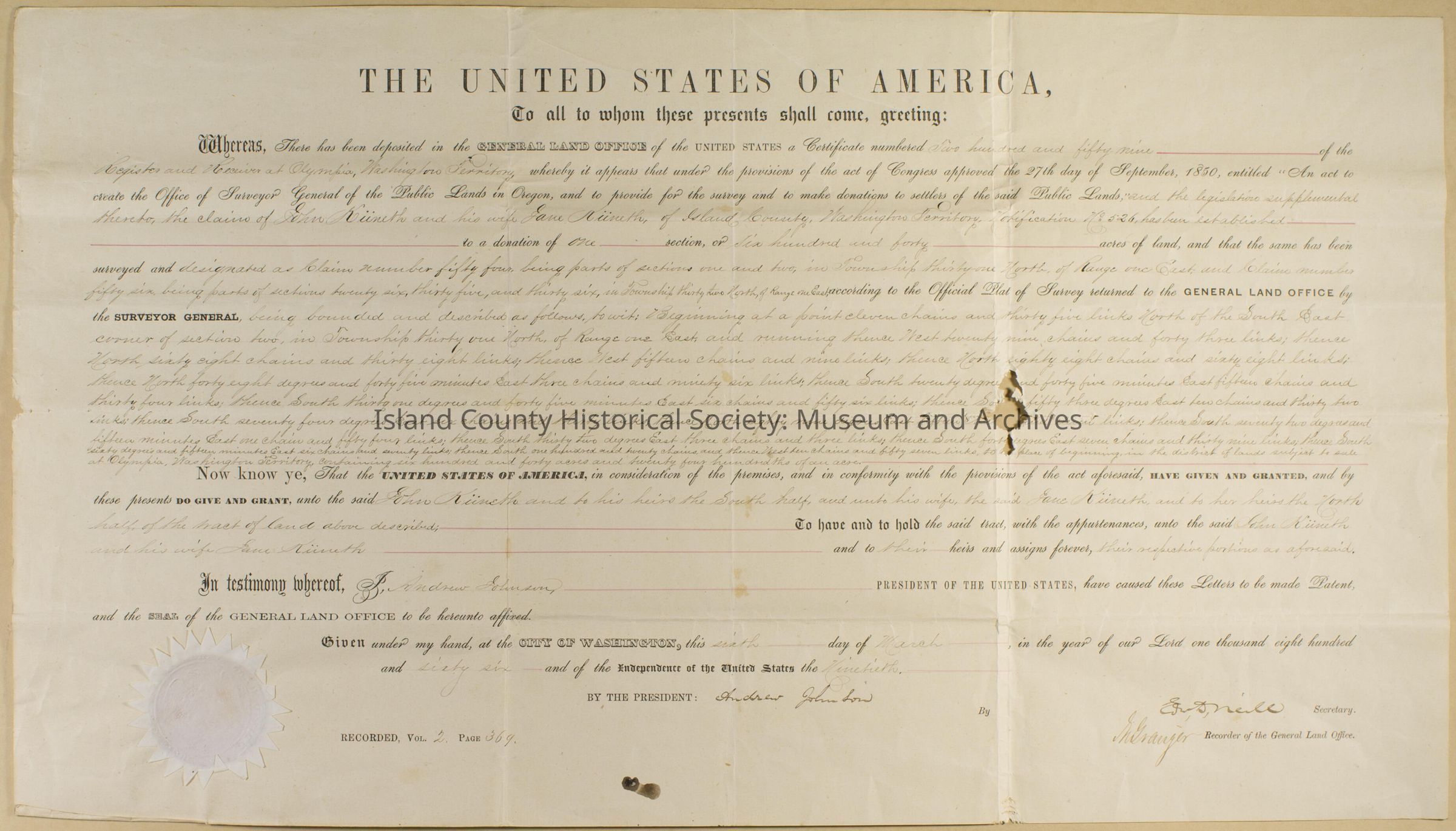 Certificate land grant claim, John and Jane Kineth; 1866 Front & back of certificate