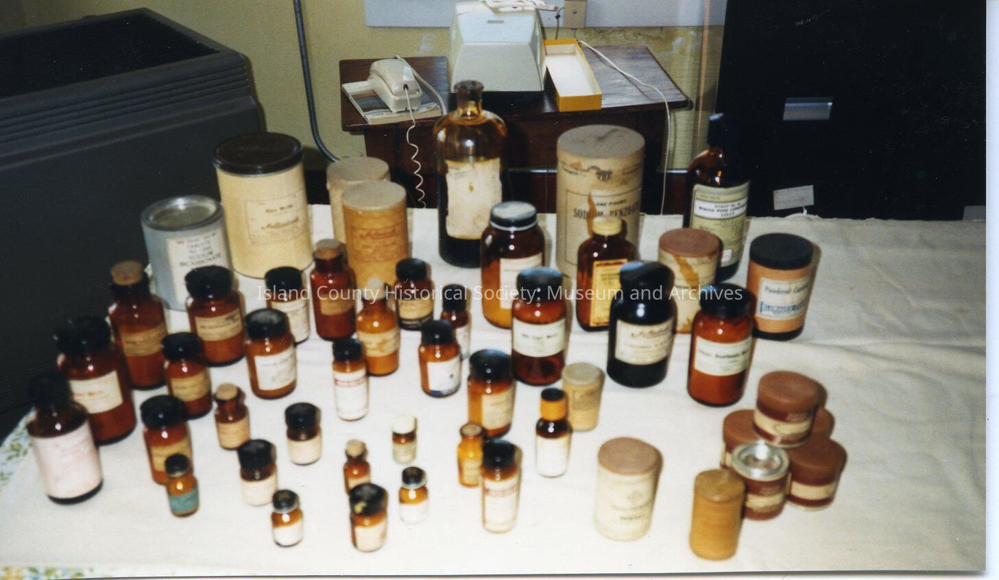 A color photo of a table with bottles and containers. The table is covered with a white cloth. In the background is a file cabinet, a table with a phone. And a metal thing in the left which is either a heater or a refrigerator.