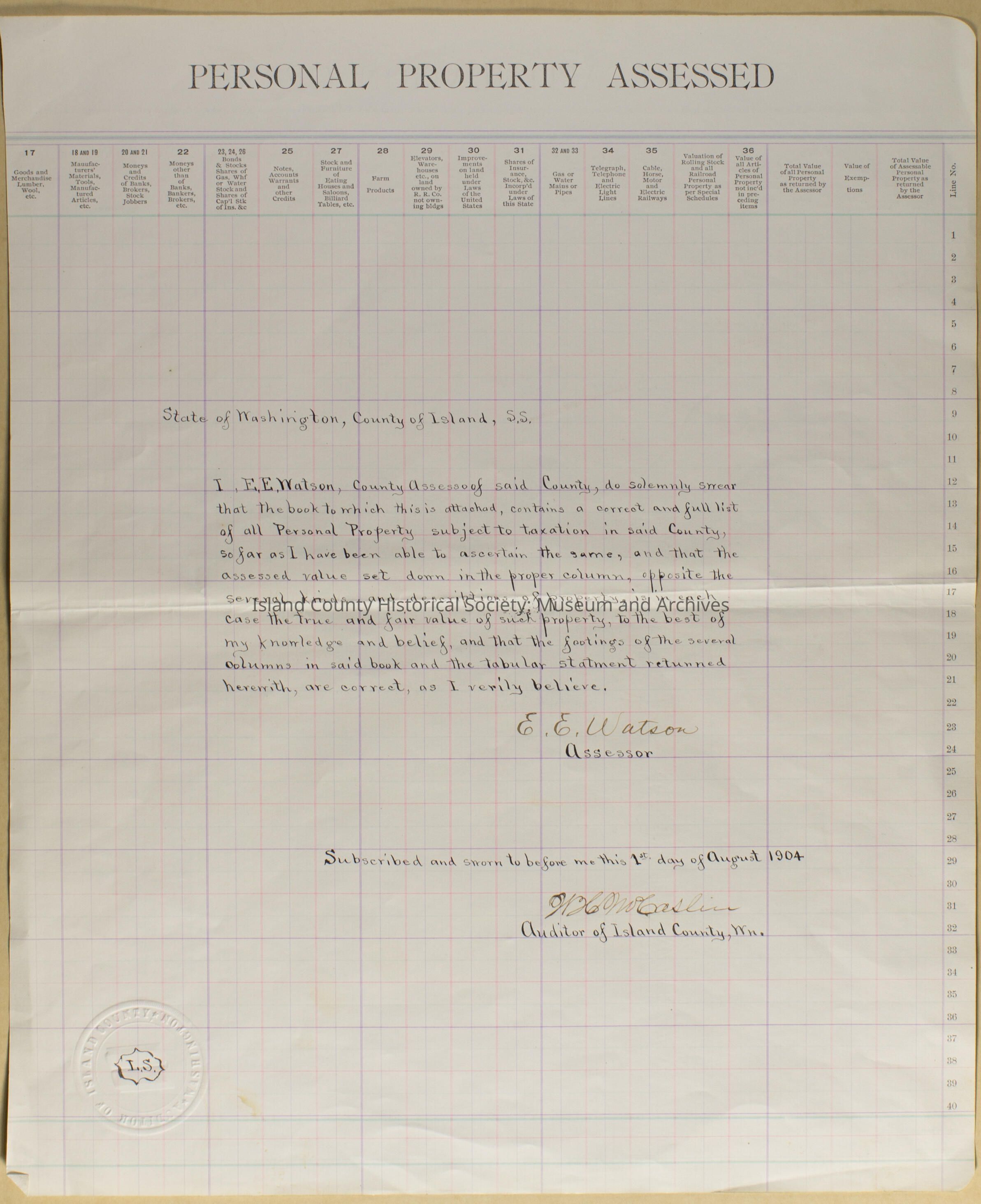 Personal Property Assessed, page from a book, E. E. Watson (Assessor), Caslin (Auditor), August 1904
