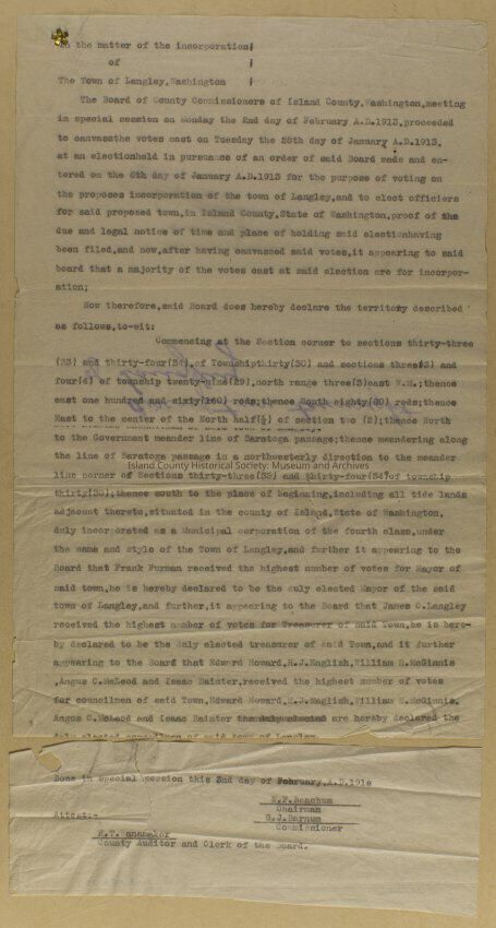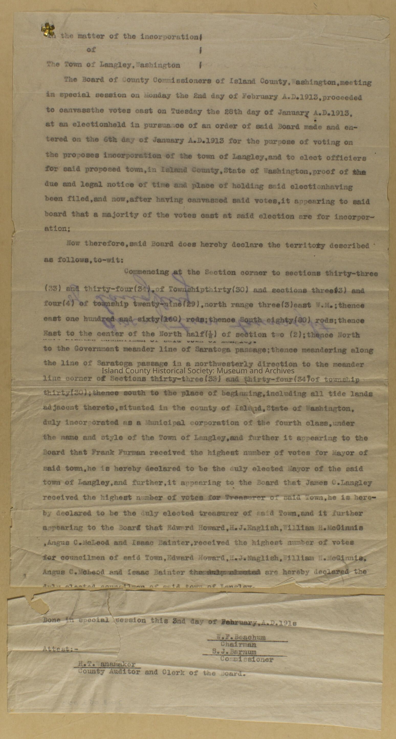 Letter re: Incorporation of Town of Langley, February 1913; H. T. Wanamaker, Auditor