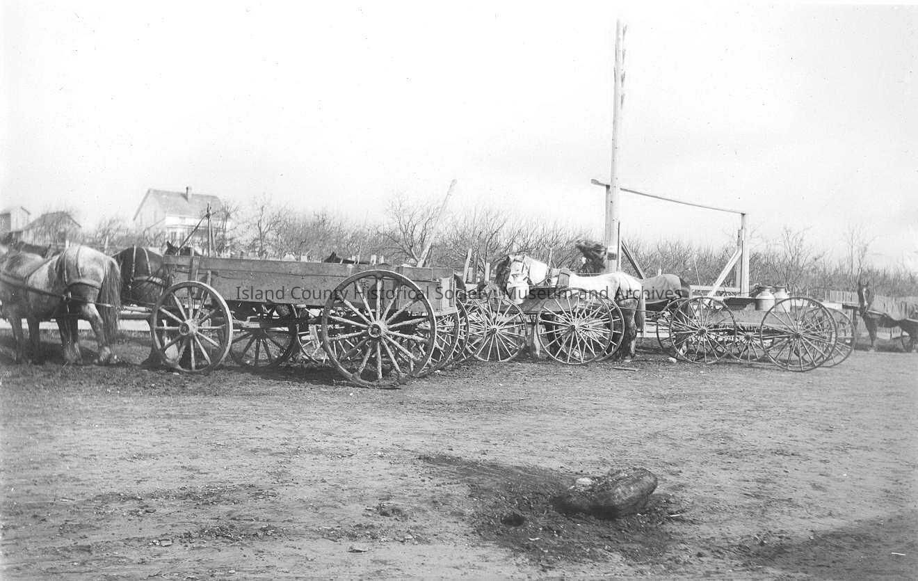 farm scene with horses pullling wagons. Large home seen can be seen off in the distance. Written on the back: Oak Harbor, in 1893