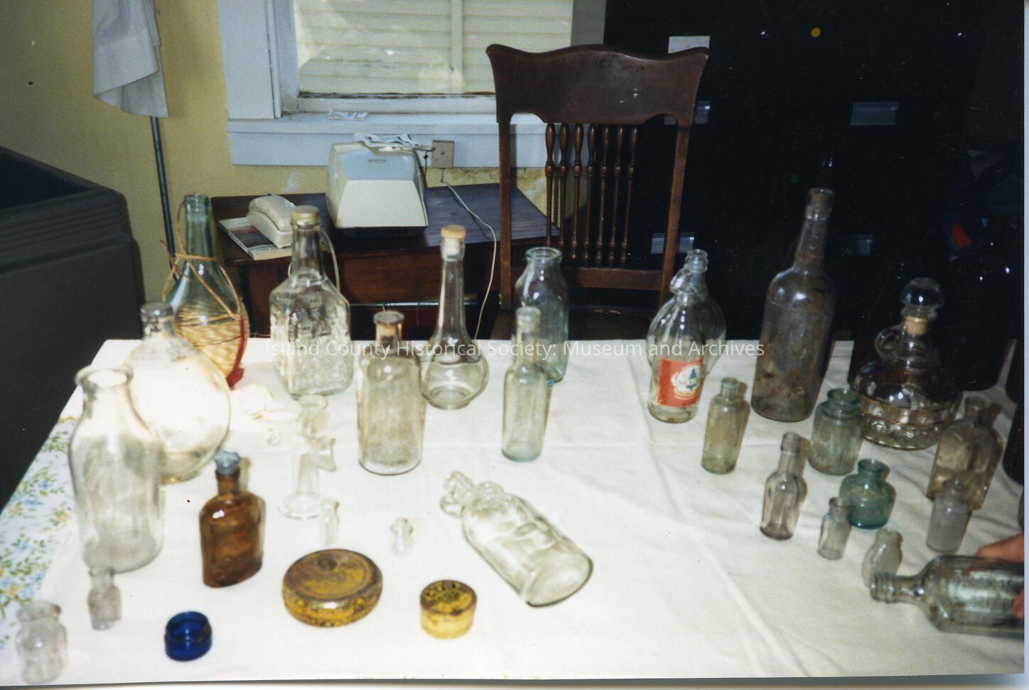 A color photo of a table with glass bottles of all sizes. The table is covered with a white cloth. In the background is a wooden chair, a short wooden table with a telephone on it. The edge of a window is in the middle. There is a file cabinet on the right.