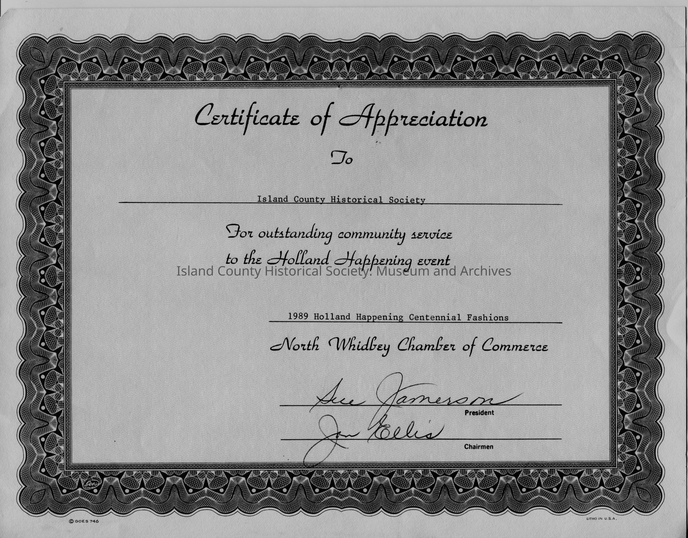 1989 Holland Happenings Participation Certificate given to the Island County Historical Society & Museum.