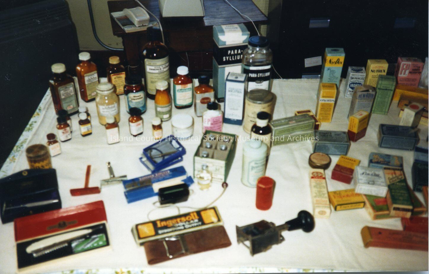 A color photo of a table with glass bottles and lots of boxes of medicine. The table is covered with a white cloth. A 'dater' is laying in the front. In the background is a file cabinet on the right.