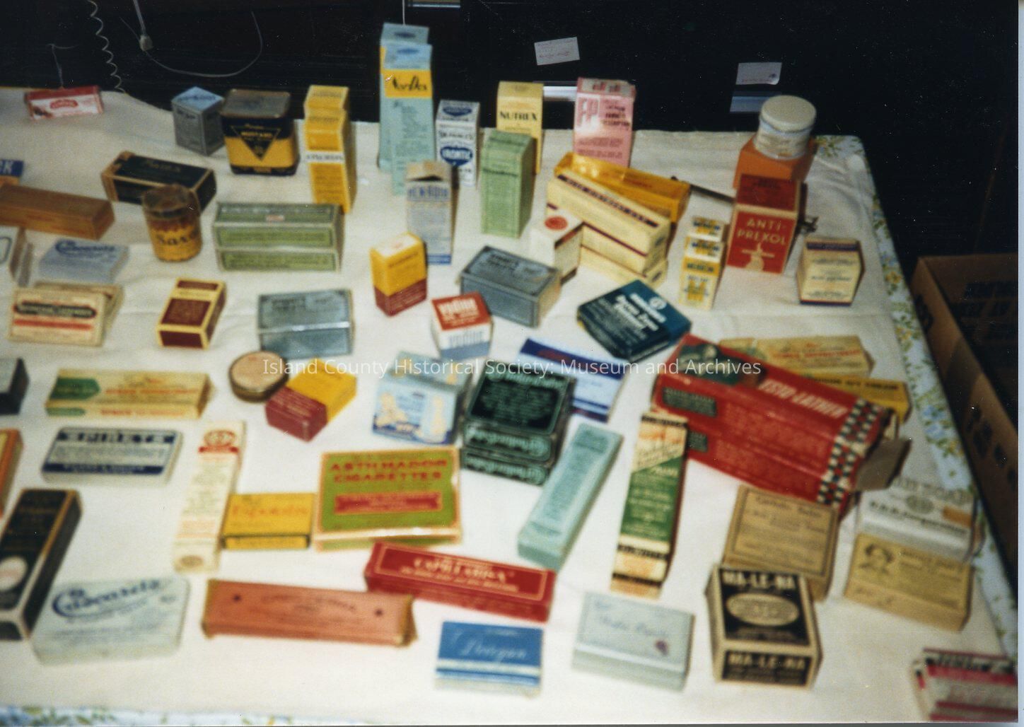 A color photo of a table with many medicine boxes. Many colors. The table has a white cloth on it. Next to the table on right is a box.
