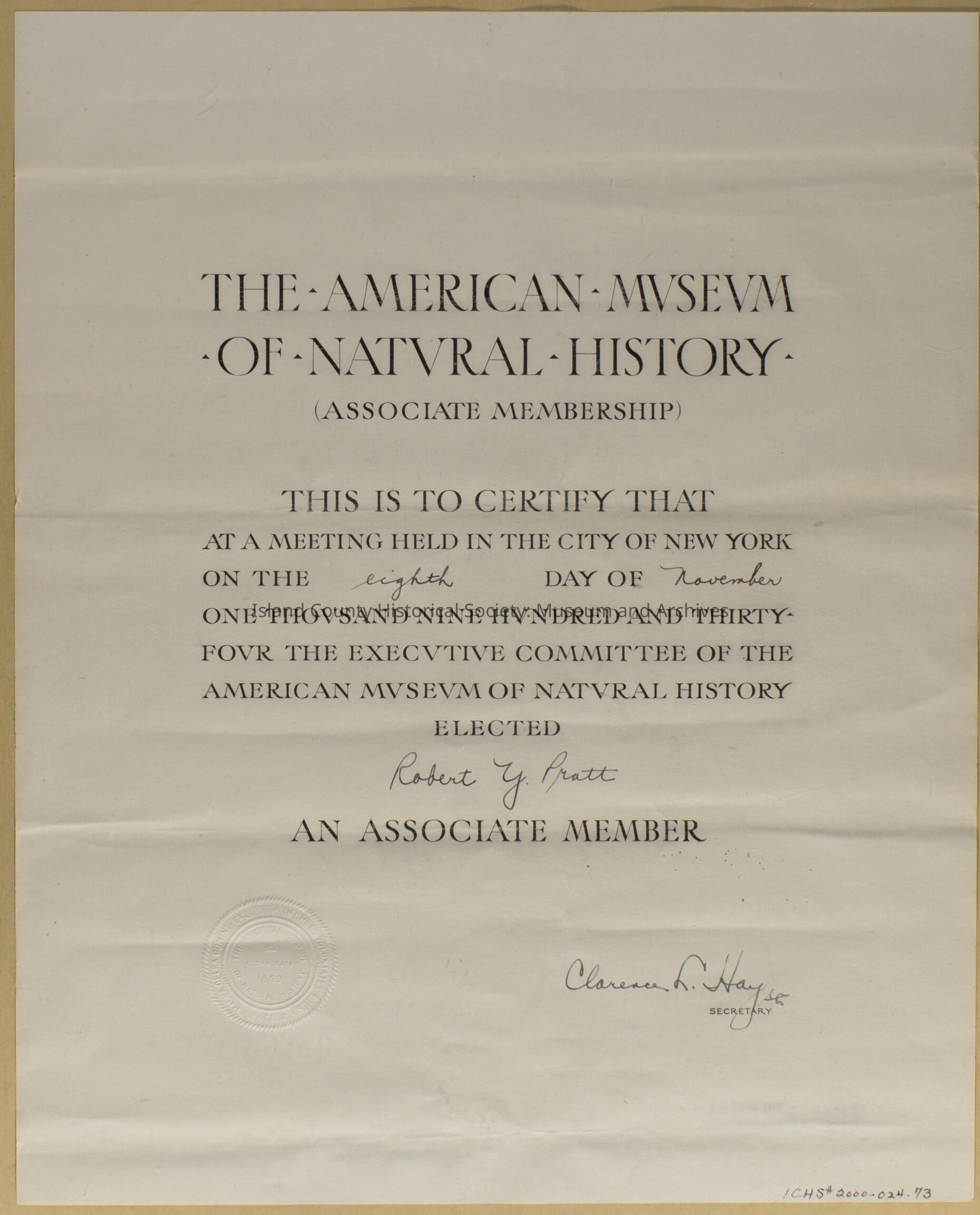 American Museum of Natural History - 1934; elected Robert Pratt as member