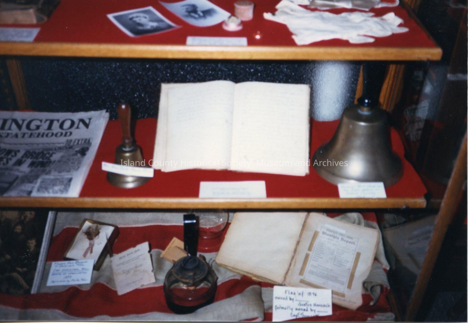 A color photo of wooden shelfs covered in red, of books, newspaper, photos, and bells. There are photos on the top shelf. Handwritten on the back is "R. Centennial Case 1989.Made/Created