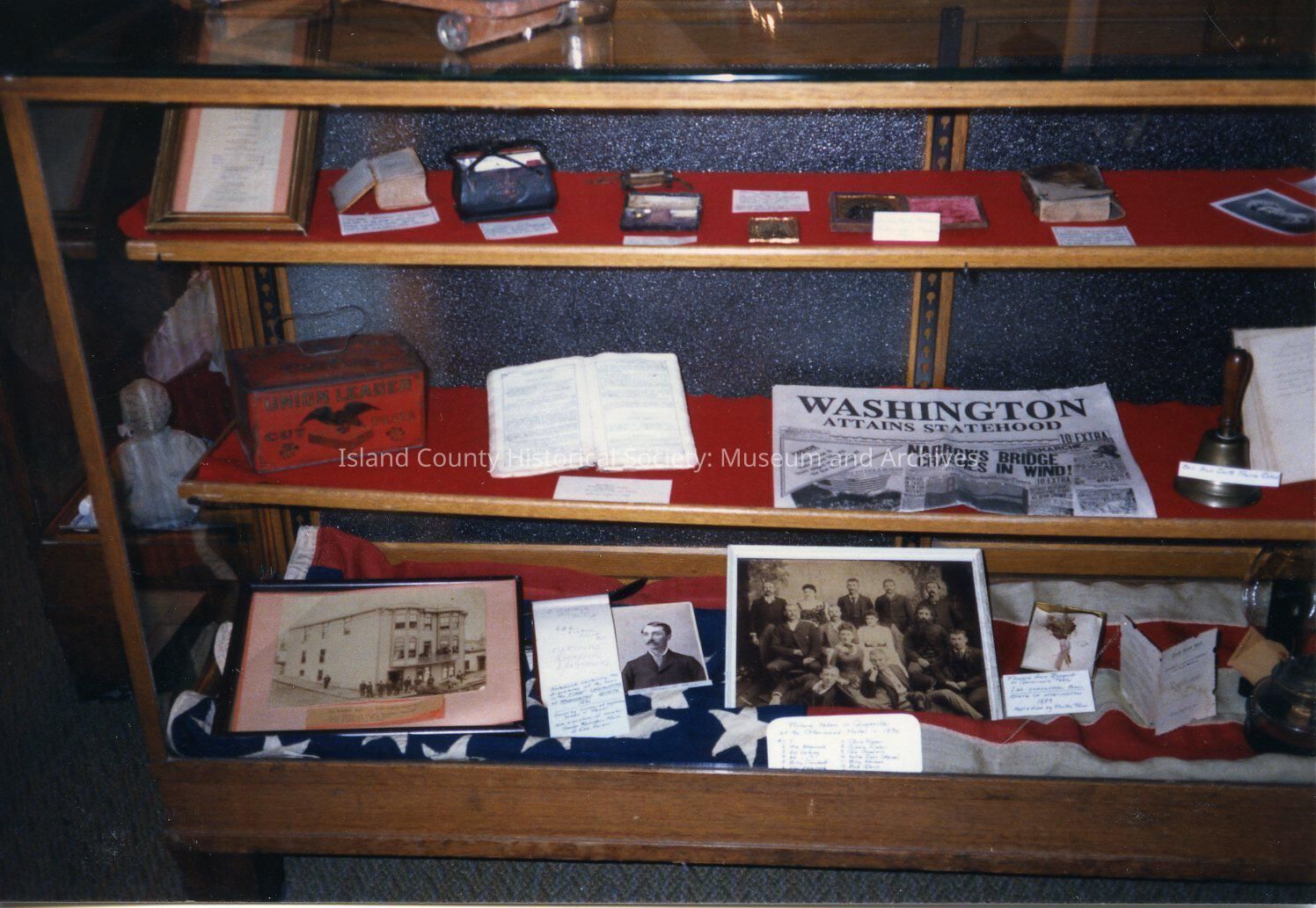 A color photo of wooden shelfs covered in red, of books, newspaper, photos, and other things. Handwritten on the back is "R. Centennial Case 1989.Made/Created