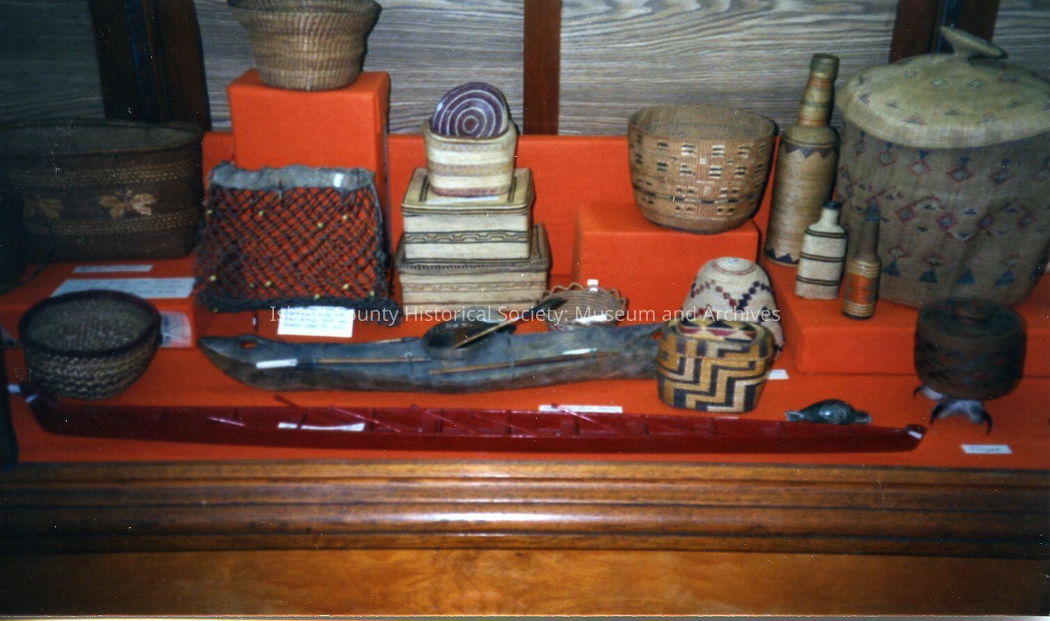 A color photo of a wooden shelf, covered in red, which showed old baskets and tools and books and bottles. Handwritten on the back is " Apr. 10, 1989."
