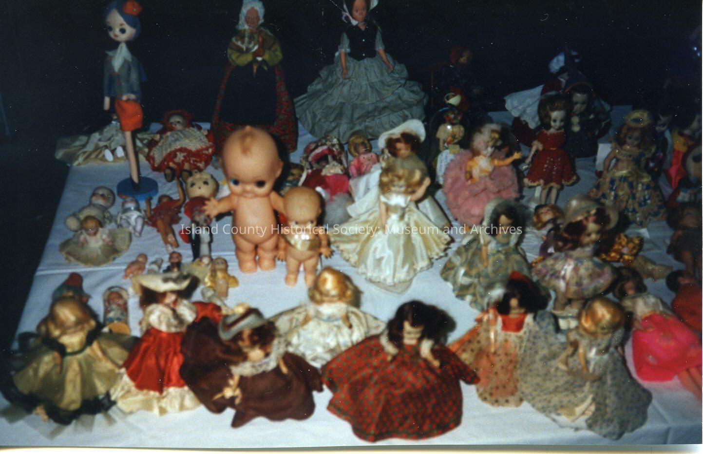 A color photo of many small dolls on a table. The table is covered with a white cloth. In the left middle there is a doll that has no clothes on it.