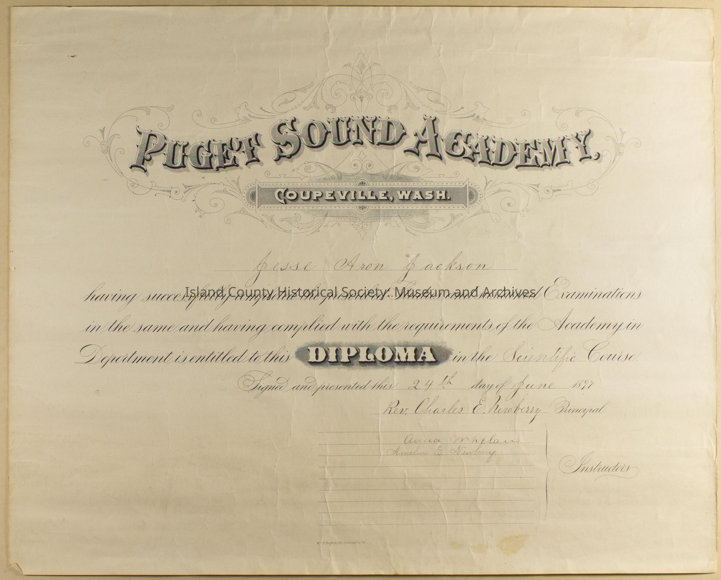 Puget Sound Academy diploma for Jesse Aron Jackson, June 24,1897
