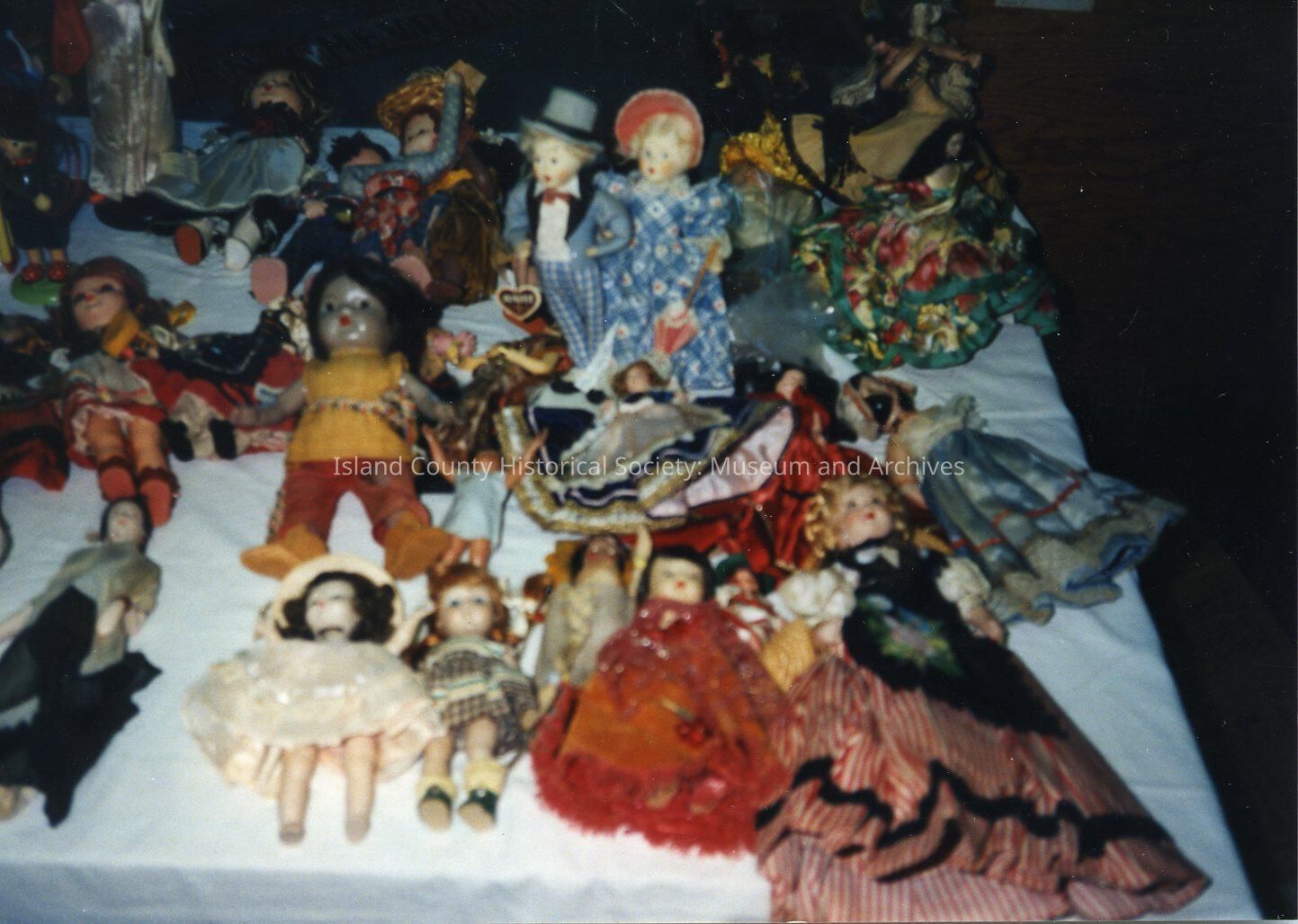 A color photo of many small dolls on a table. The table is covered with a white cloth. On the right front is a doll wearing a long dress with stripes on the bottom. There is on the left middle a doll with darker skin (Indian?).