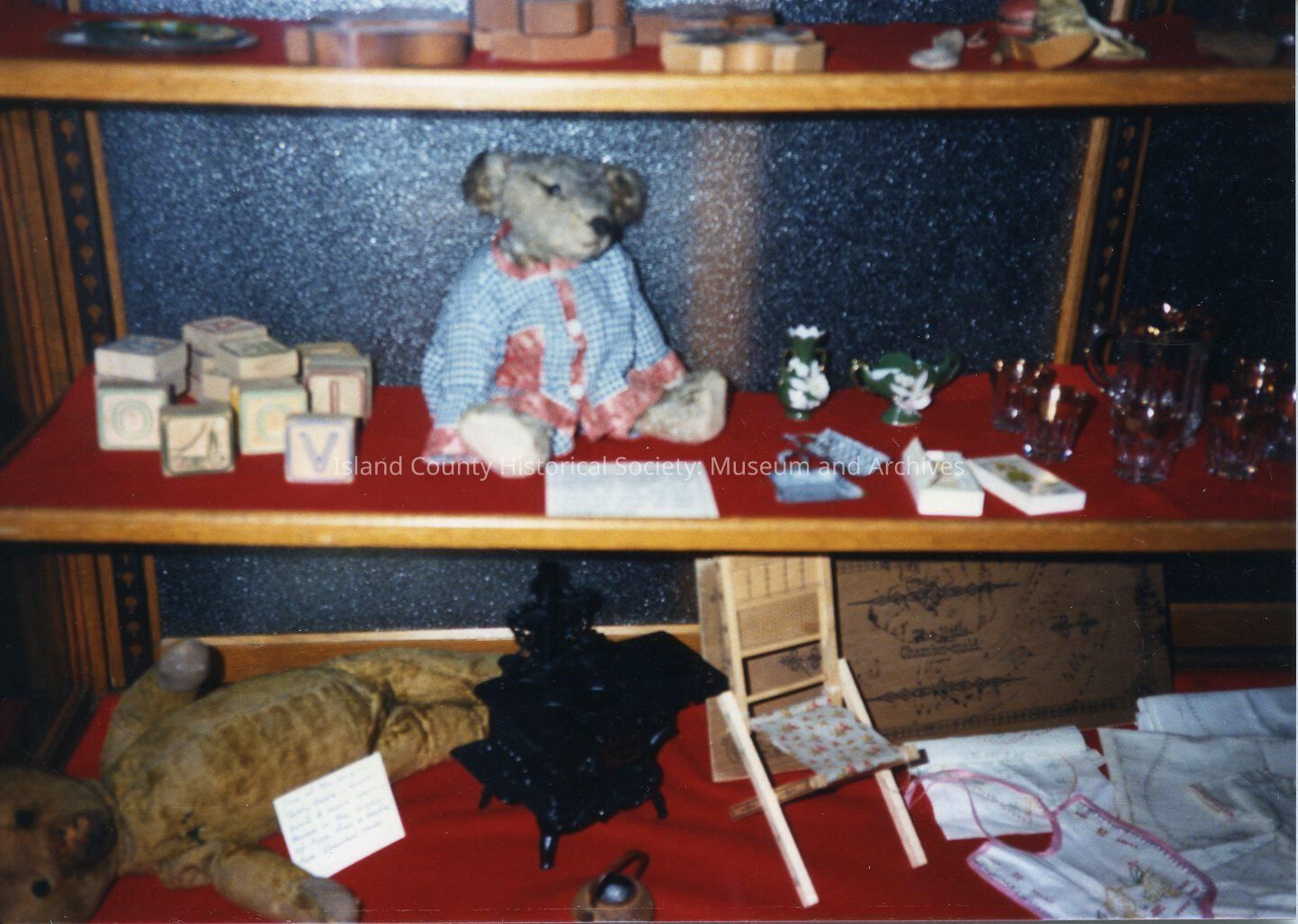 A color photo of wooden shelfs with red on the shelf, a stuffed bear toy and other toys and letter blocks. Handwritten on the back is "Toy Case '88. Doll Case 1989."