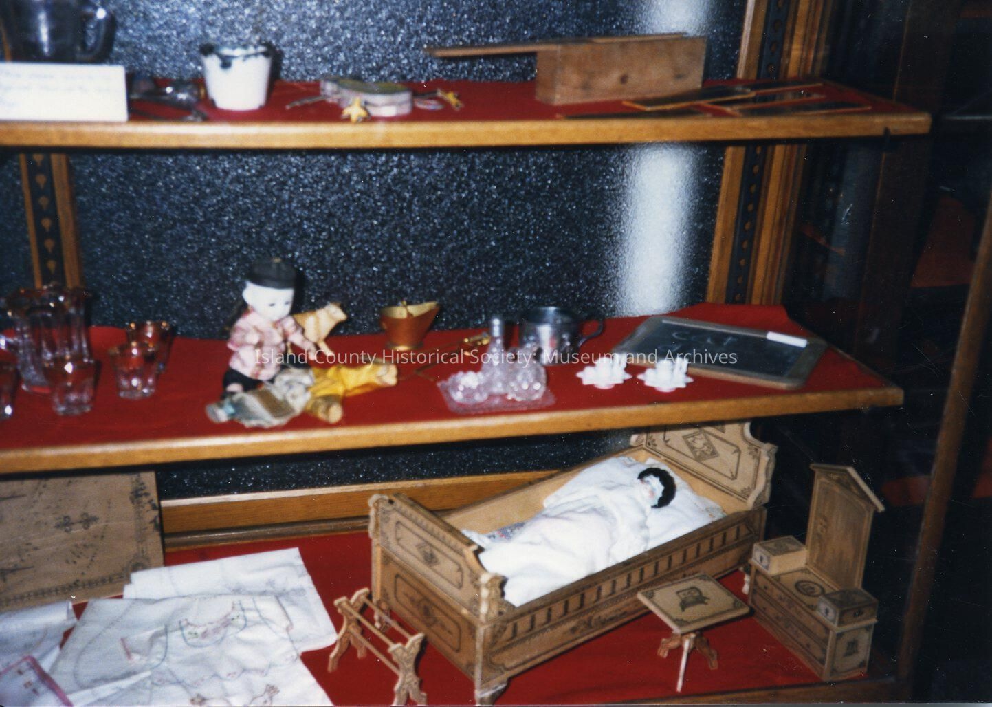 A color photo of wooden shelfs, covered in red, of toys. On is a crib and has a doll in it. Next to the crib is a dresser and a table. Handwritten on the back is "Toy Case '88."