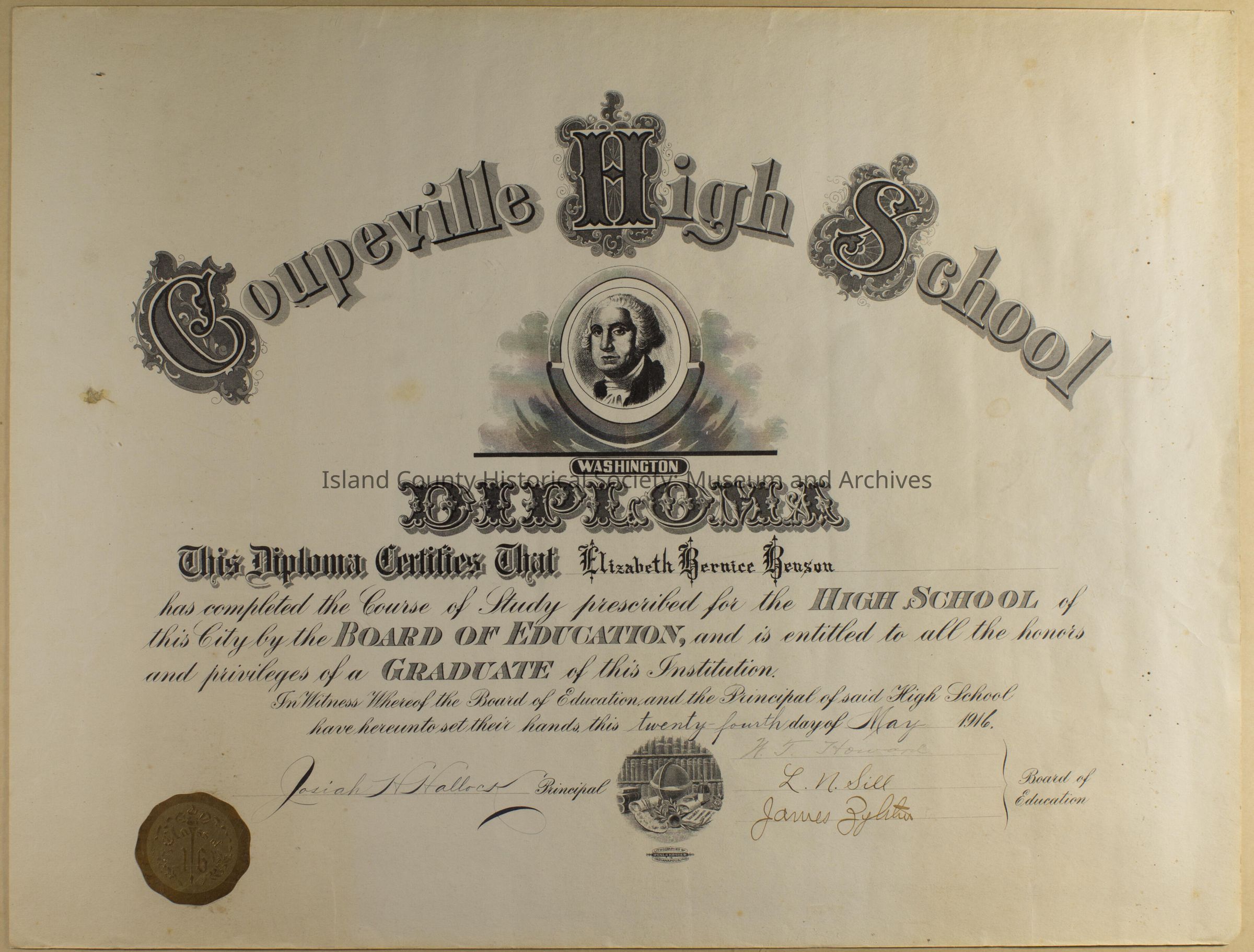 Coupeville High School diploma for Elizabeth Bernice Benson, 1916