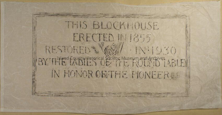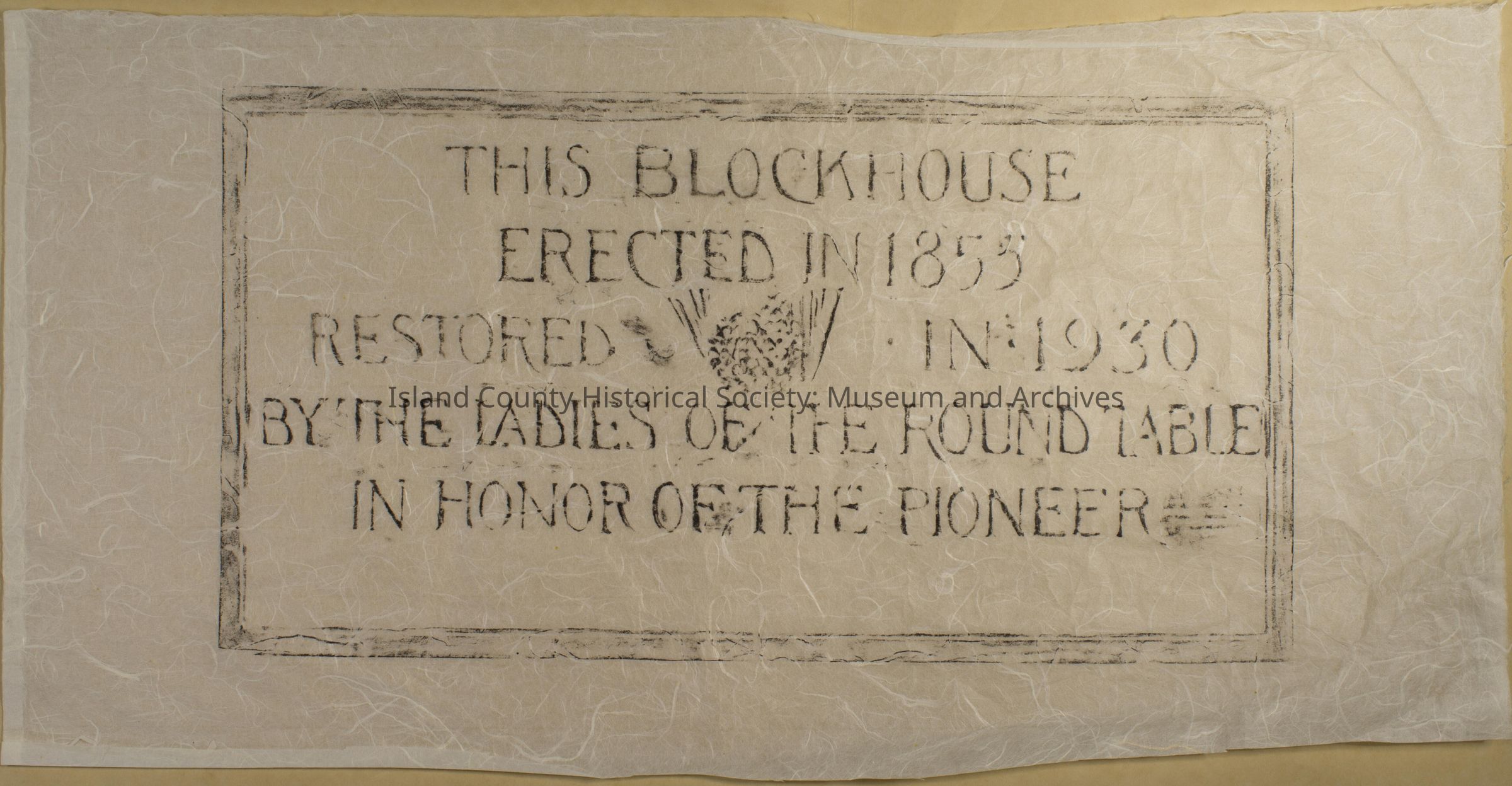 Blockhouse restoration marker rubbing. "This blockhouse erected in 1855; restored in 1930 by The Ladies of the Round Table in honor of the Pioneer"