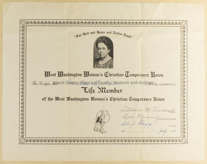 Ida LeSourd Life Member, Women's Christian Temperance Union, July 1927 Certificate