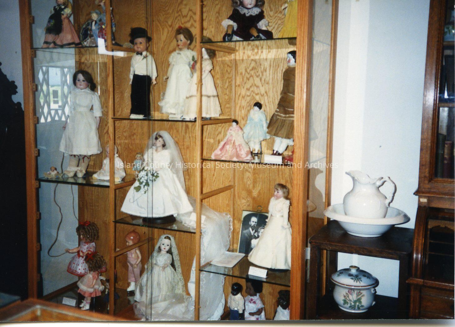 A color photo of wooden shelfs with several dolls. There looks to be wedding dress on several dolls. On the right is a whie pitcher and bowl. Handwritten on the back is "Doll Case. Apr.1990."