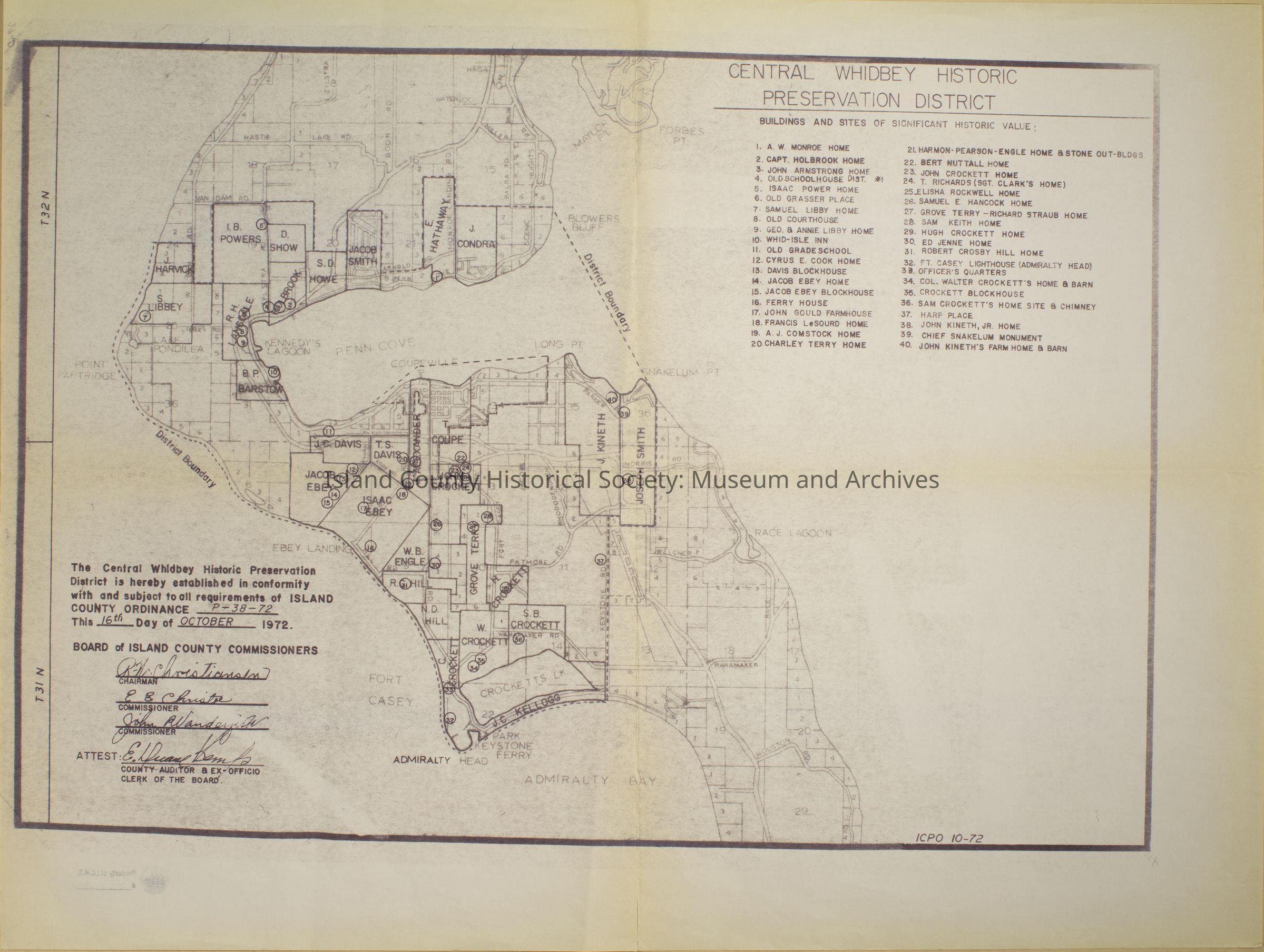 Map of Central Whidbey Historic Preservation District showing buildings and sites of significant historic value. Dated October 16, 1972.