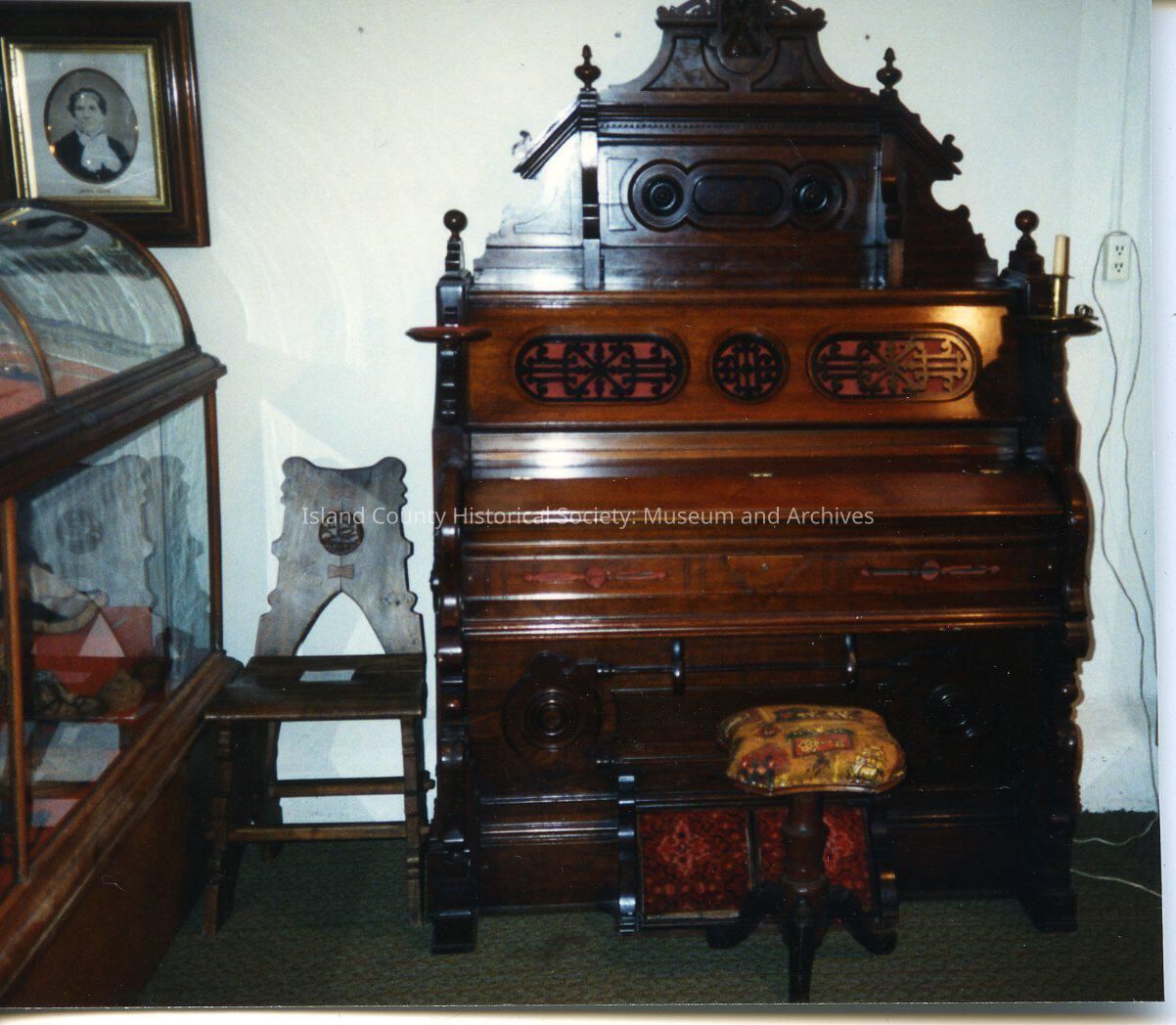 A color photo of an old Organ. Next to it is a small wooden chair. On the left is a picture on the wall. Handwritten on the back is "Organ & Stool Apr. 1990."