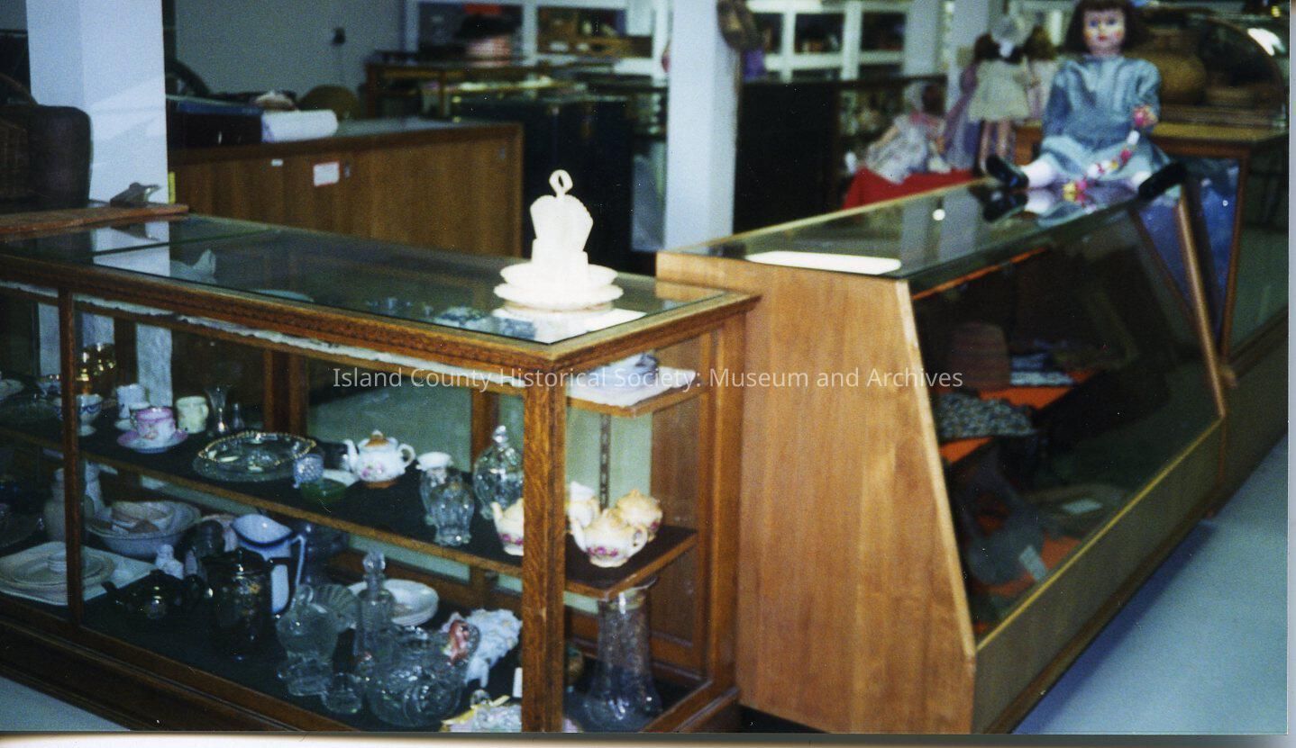 A color photo of two wooden counters with shelves. One on the right side has a doll sitting on top. On the left are shelfs with a tea set, some glass bottles and platters. Handwritten on the back is 10-24-94 Corner view."