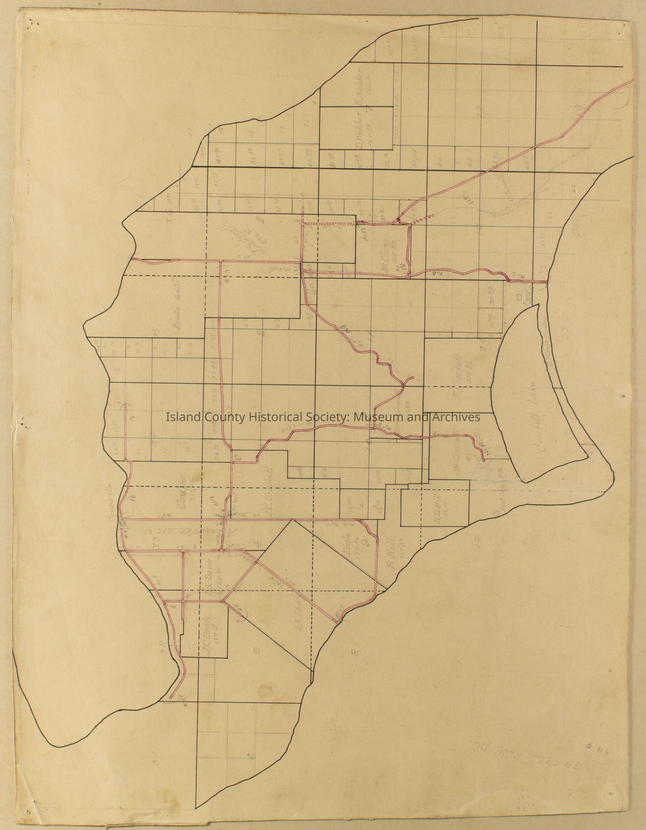 Hand drawn map of Coupeville showing land grant claims and roads