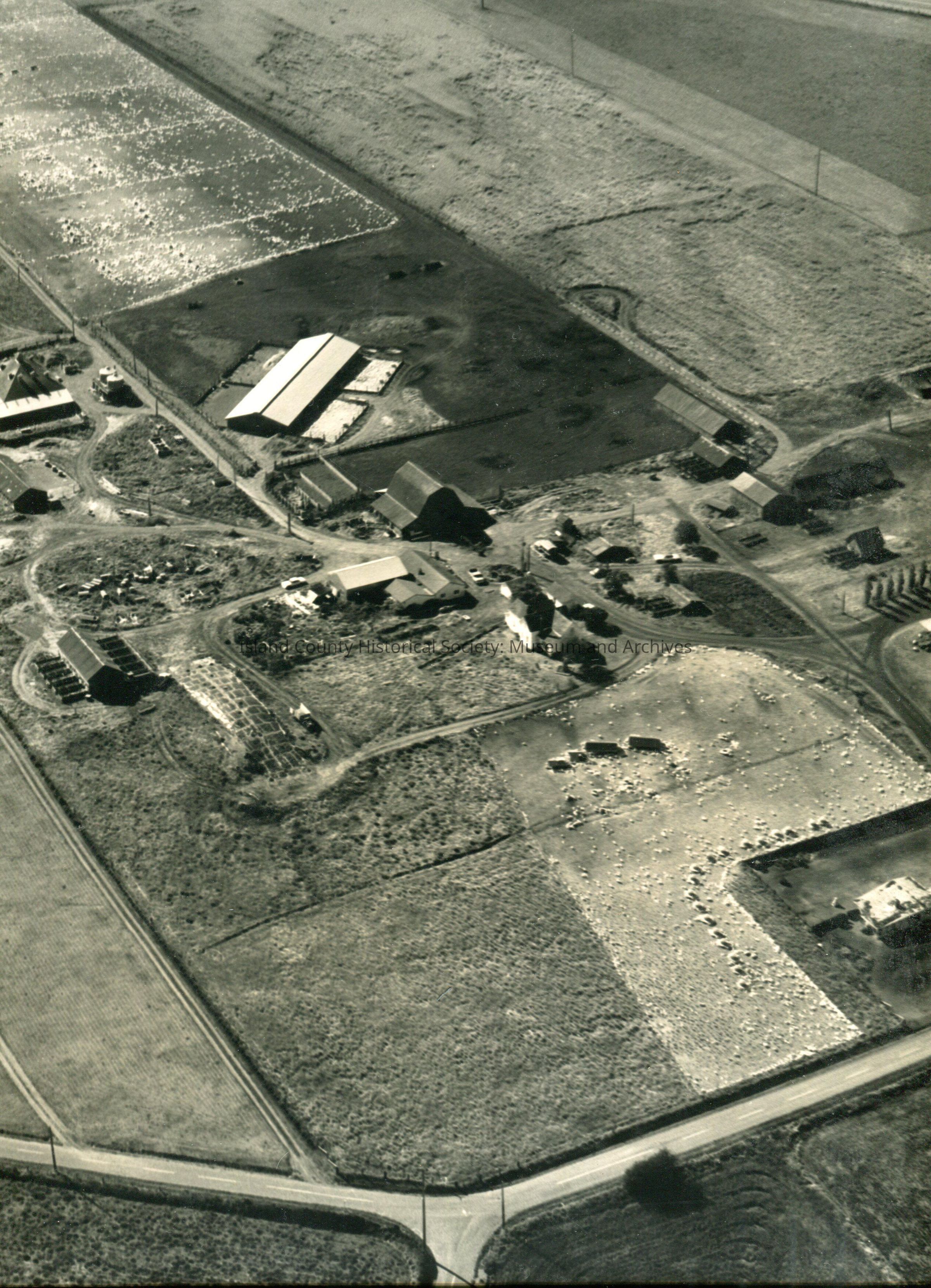 Portrait photo featuring two major roads, one at the top abd one at bottom of photo. Farmland of Ebey's Prairie. Farms with barns and residences visible. Several blocks of fields speckled with little white fuzz balls (presumably the Sherman Turkey Farm). File no. W-32-9 on the back