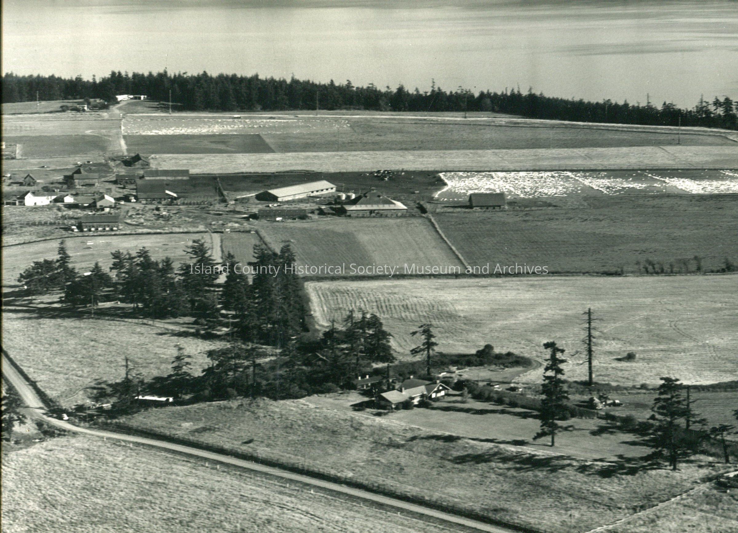 On the back has the title/description given. File no. (no no. given) on the back. Prairie land with country roads, residences and turkey farm (Sherman's). Then edge of island populated with tall trees. The still water is seen towards the top of the photo and San de Fuca in the background.