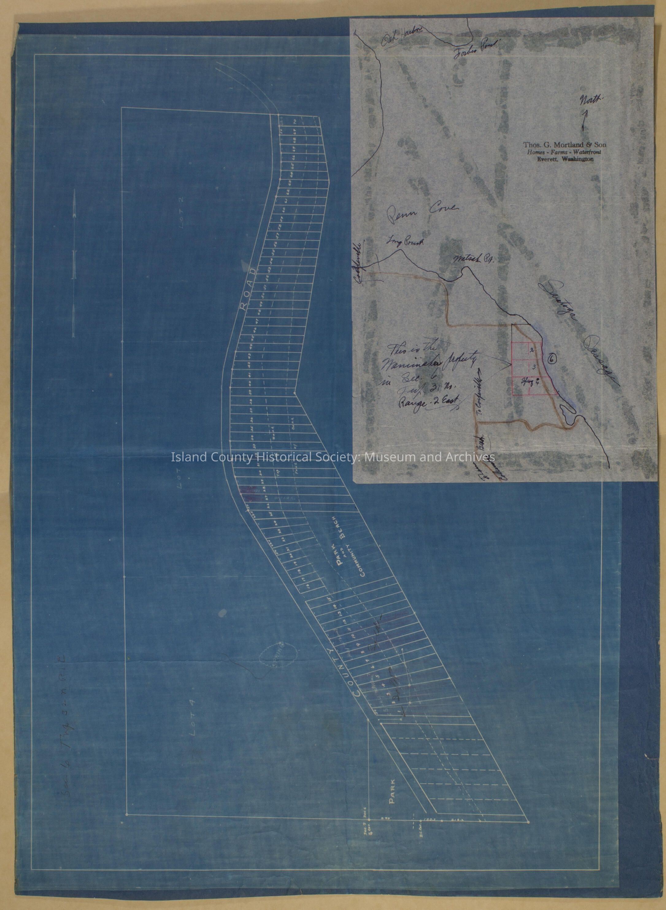 Park and community beach blueprint and tract map. Hand note attached with "This is the Wanamaker Property in Sec 6, Twn 31N, Range 2E".