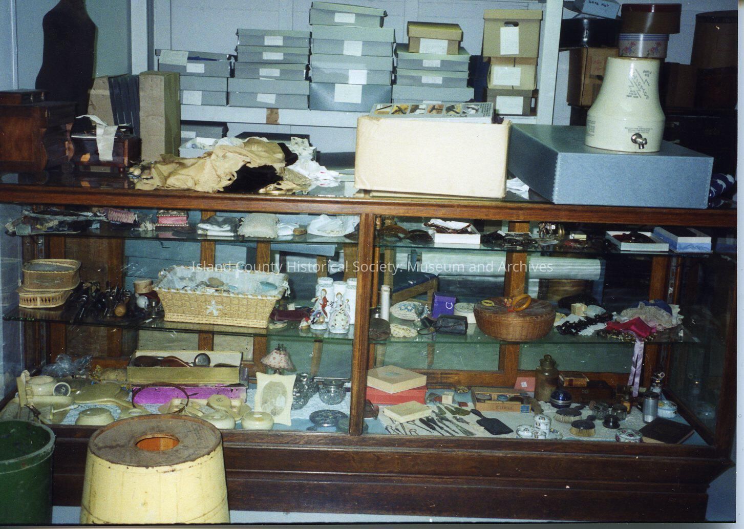 A color photo of wooden counter with glass case of shelves with older things inside. In the background are boxes stacked up .