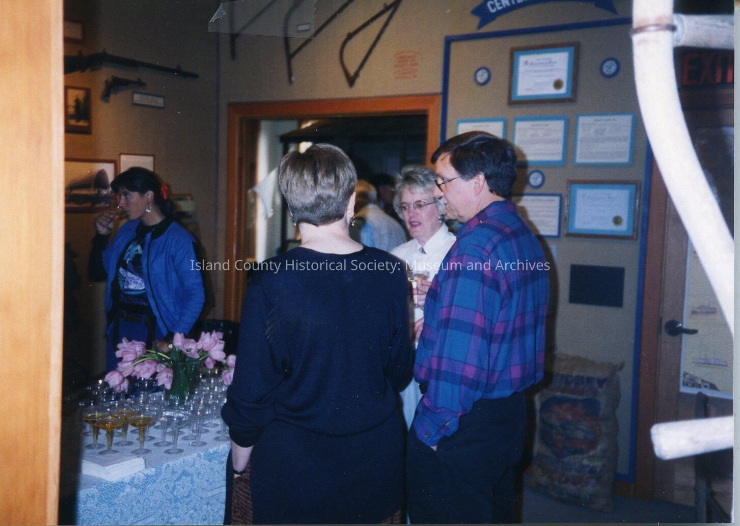 A color photo of several people with wine glasses on the table. There are pink flowers on the table. Handwritten on the back is "Gretchen Ebey's , Bruce & Mary - Postmaster & wife - Carol Olson, May 5,1995."