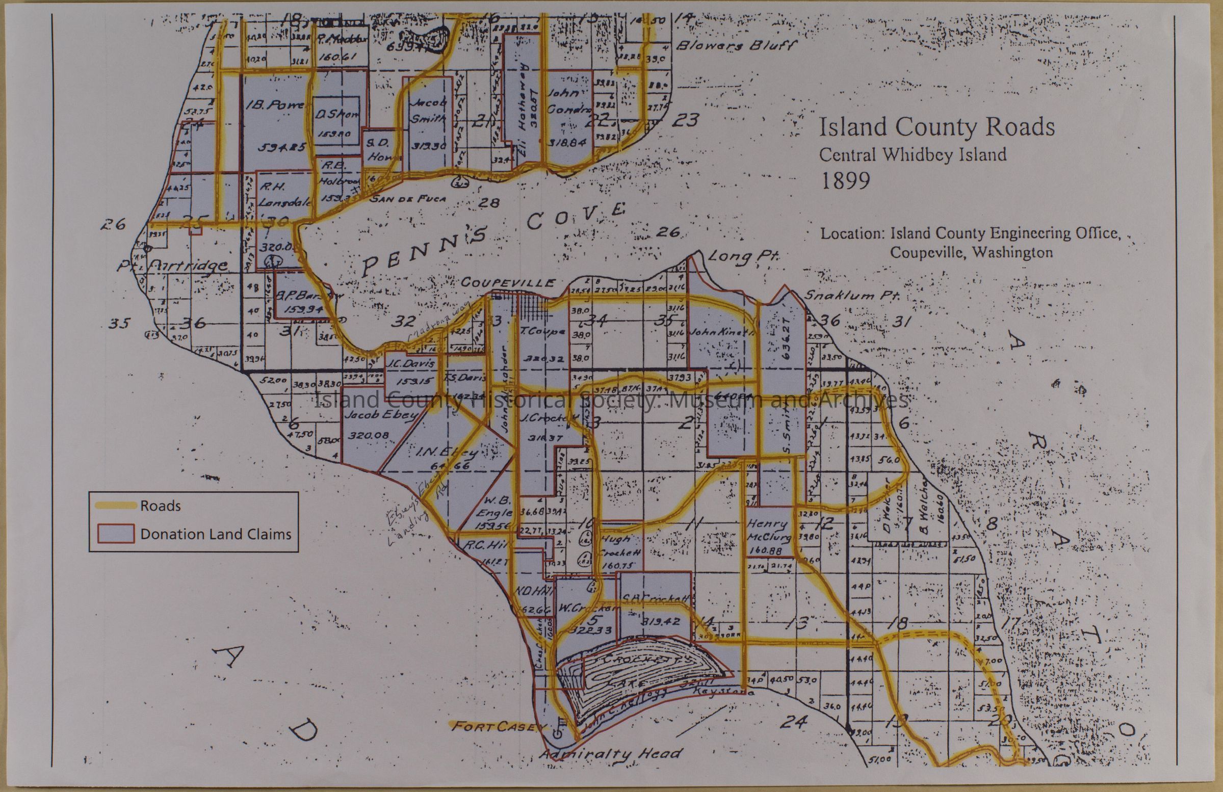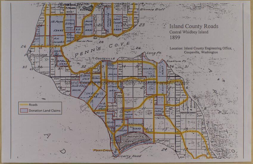 Island County Roads Central Whidbey Island 1899; highlights donation land claims