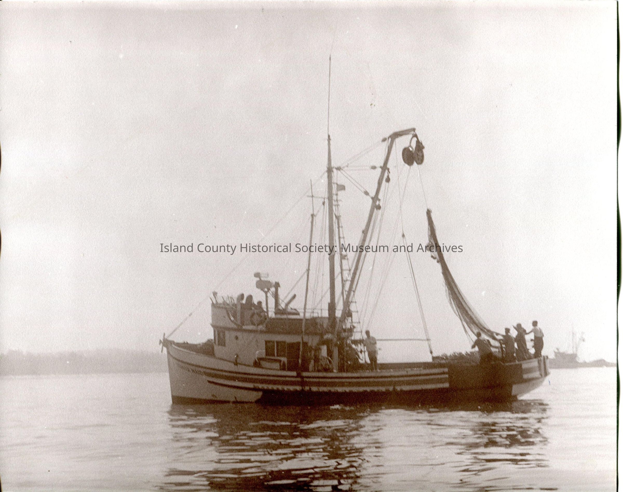 A photo of a boat in the water. There are about five men visible in the boat. Four of the men are at the back of the boat, working with a large net. The other man is in the middle of the boat, also helping with the net. There is another boat in the background on the right side of the photo. There is land in the background on the left side of the photo.