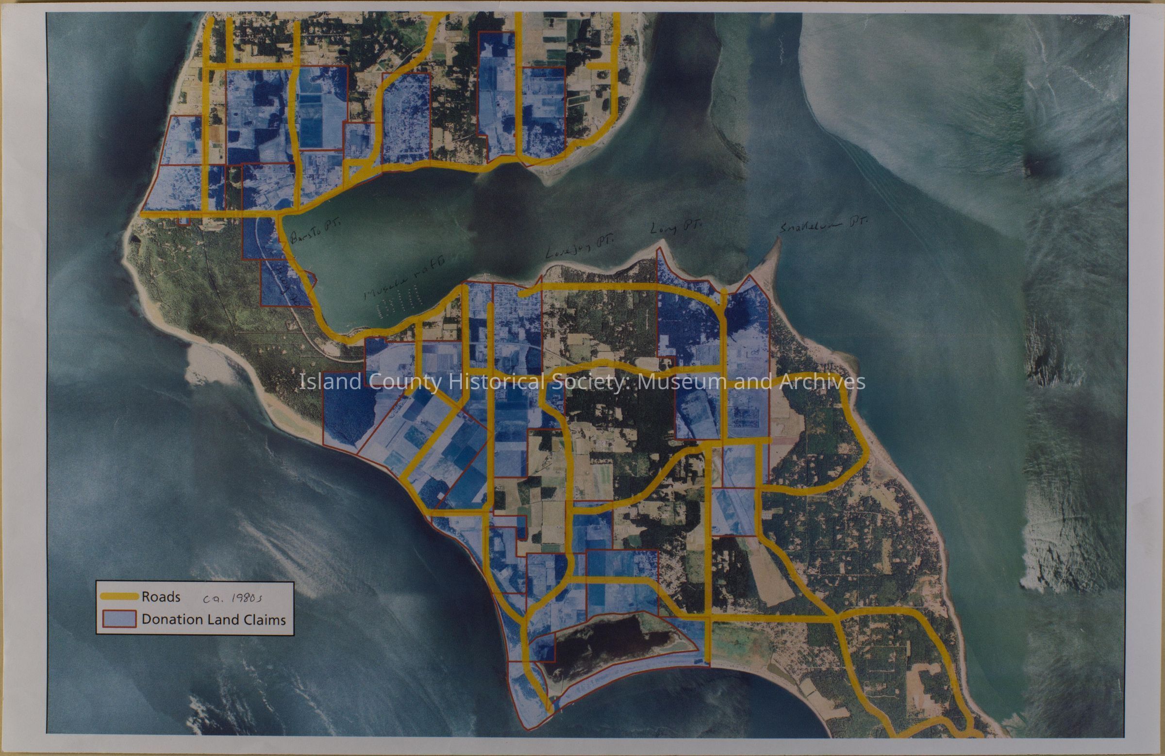 Crockett Lake area; roads and donation land claims highlighted; satellite map