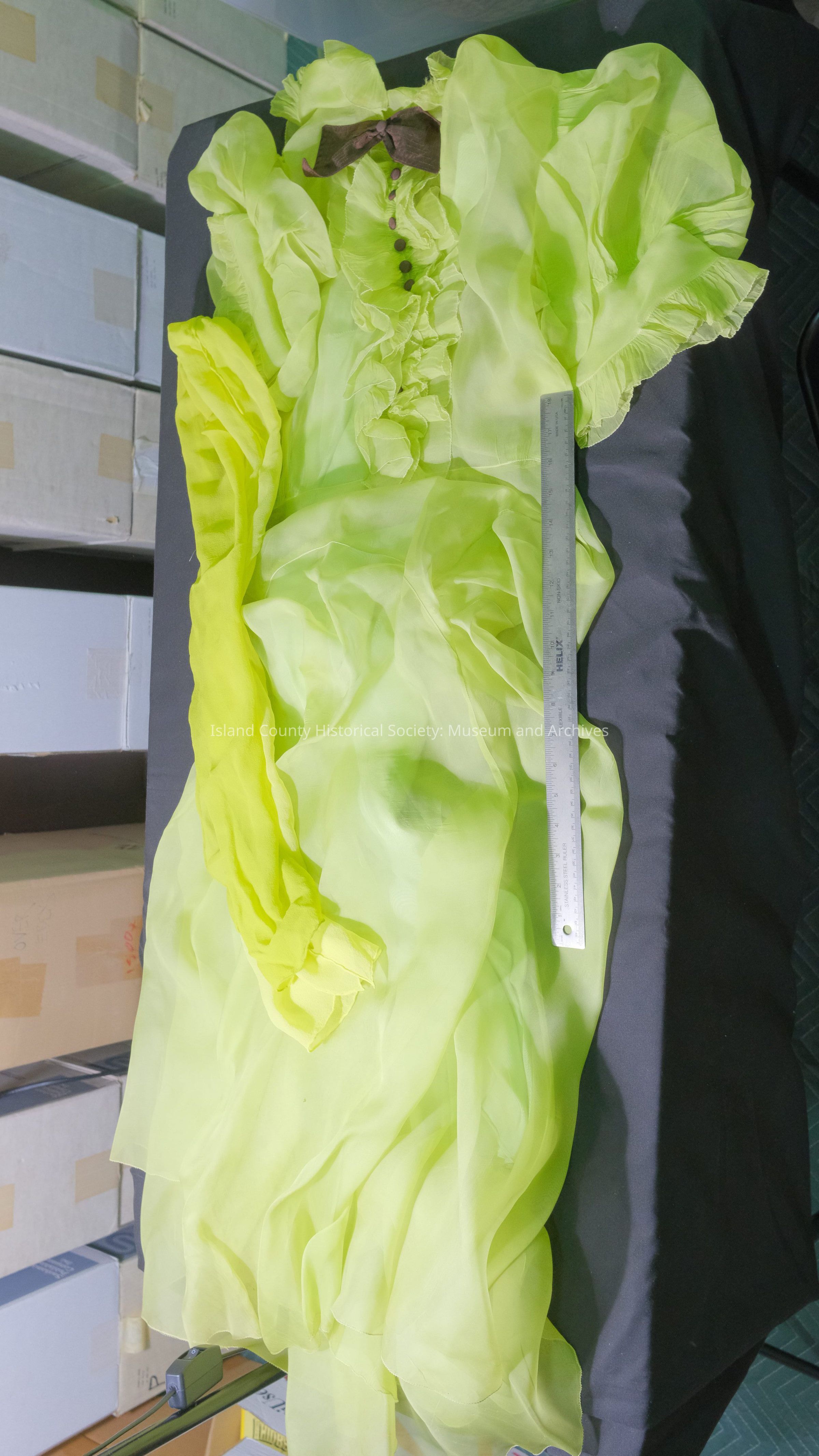 Lime green organdy long dress with pleated jabot with brown buttons and bows. (Matching slip item # 1970-41b).