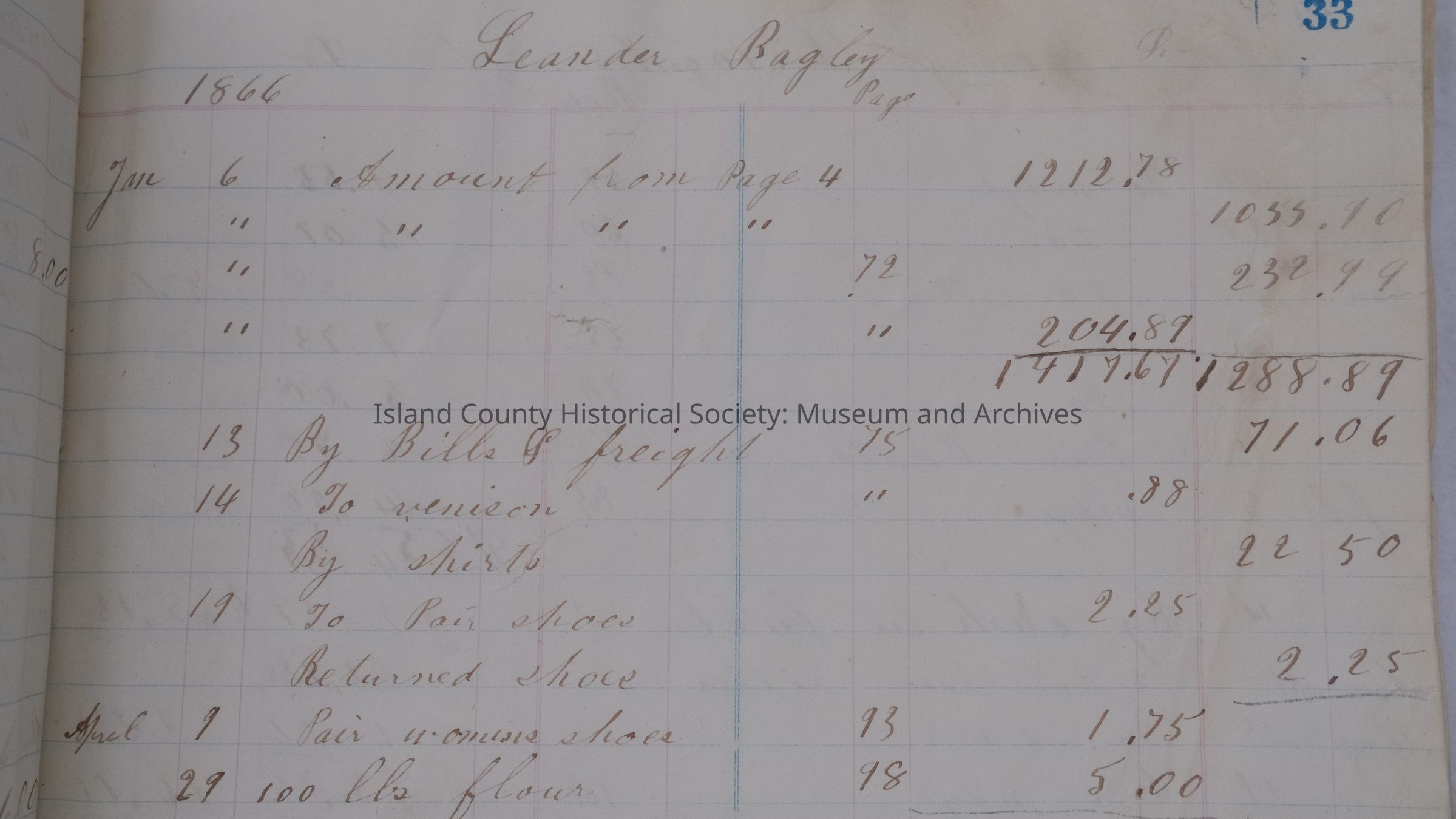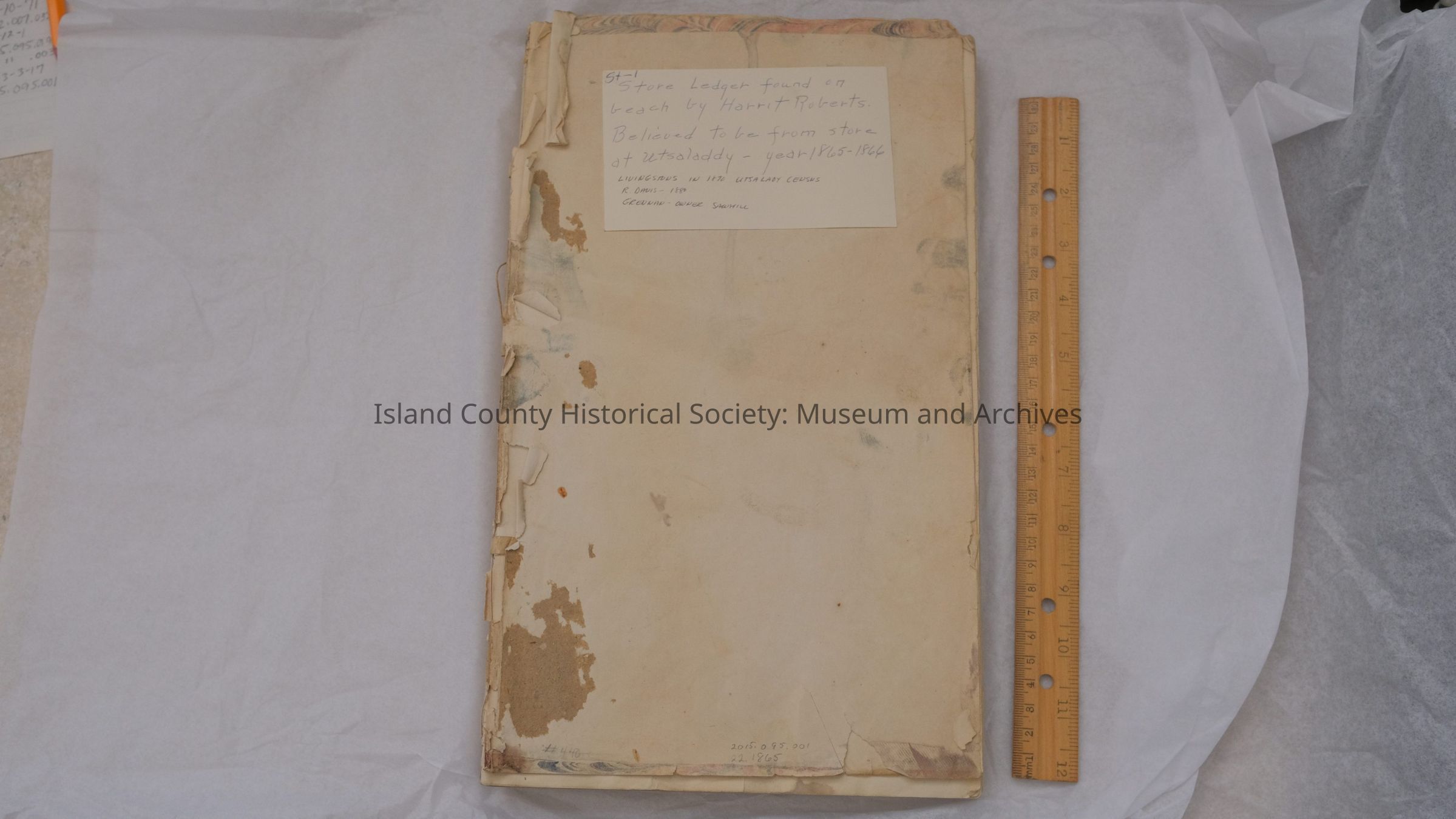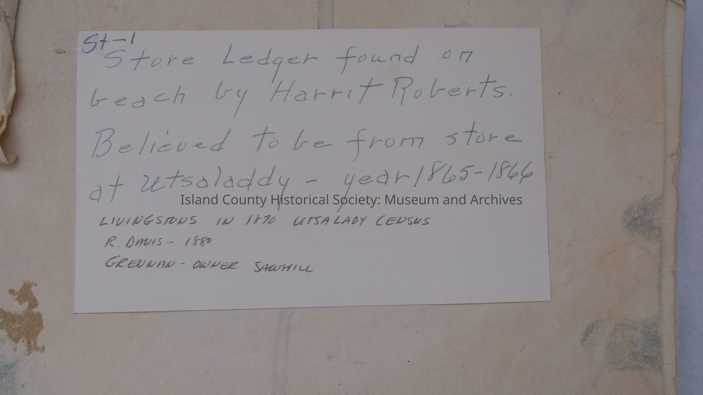 Ledger, On card on front: Store Ledger found on beach by Harrit (sic) Roberts. Believed to be from store at Utsalady - year 1865-1866. Also written: Livingstons in 1870 Utsalady Census R Davis 1880 Grennan - Owner Sawmill; (in accession book: Acct book from Utsalady Store - 1865 - washed in on tide, given by Harriet Roberts), no cover, bad shape, 8" W x 13.25"L x 1" H) Old: #440 New: 2015.095.001 22.1865Lexicon