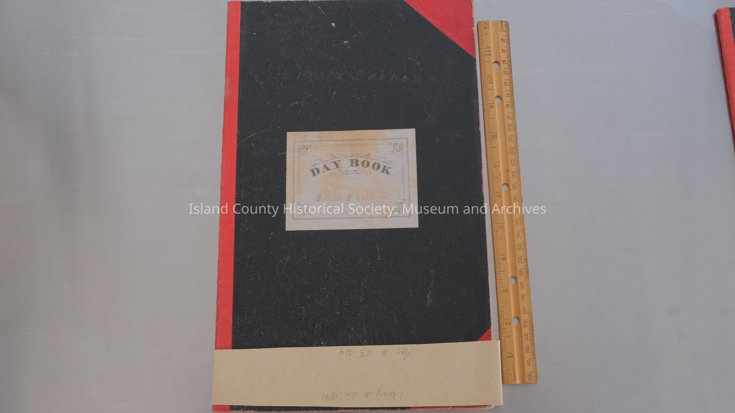 Ledger for Elmer E. Calhoun, November-December 1891. (Black cover, red corners and spine; on cover: Day Book, written: Elmer E. Calhoun; 8.5"W x 13.5" L x .25" H) 73-24 22.1891