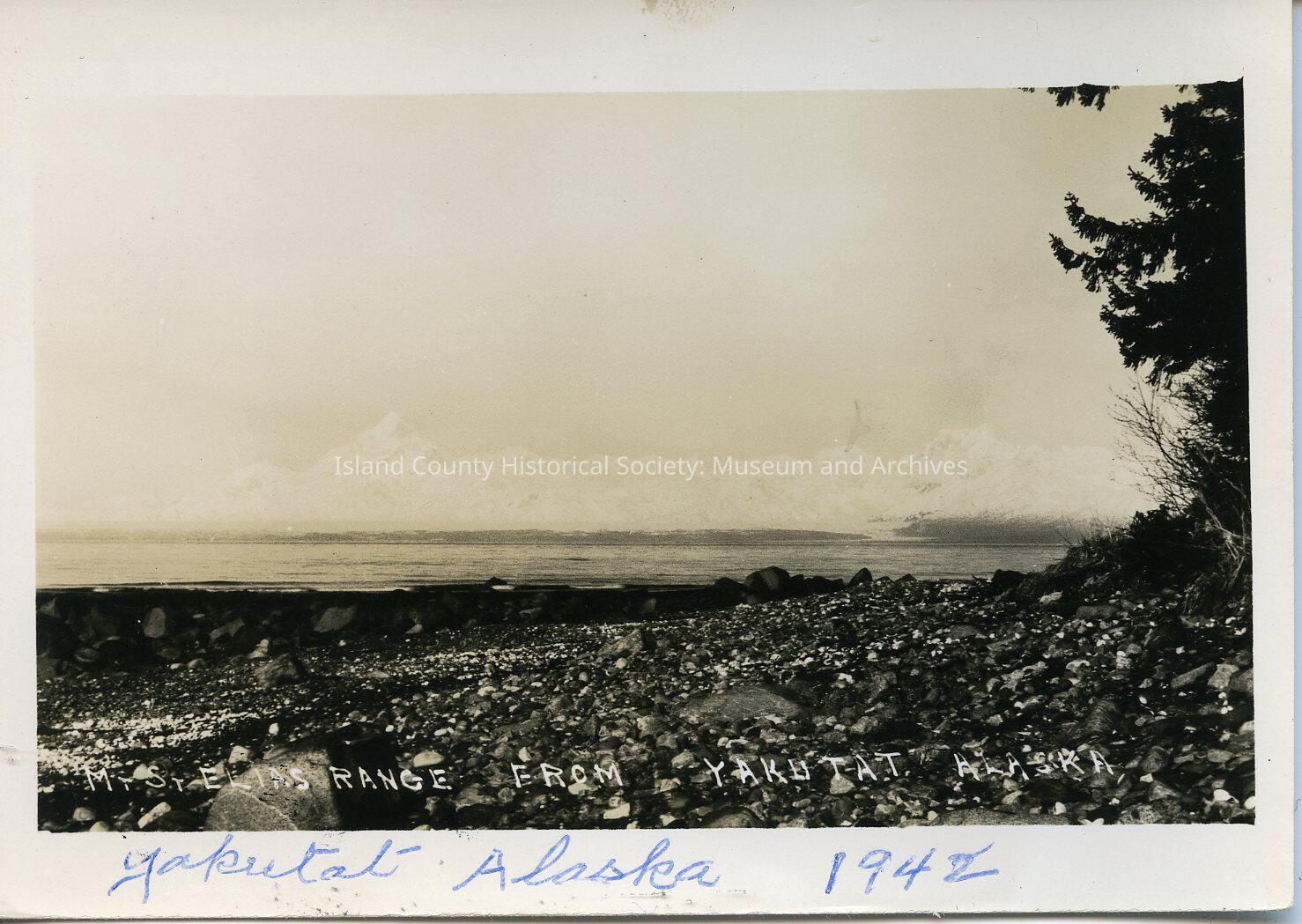 A photo of the the town Yakutat, Alaska, 1942. Handwritten on the front is "Mt St Elias Range from Yakutat, Alaska." From old entry: From Calhouns 1942