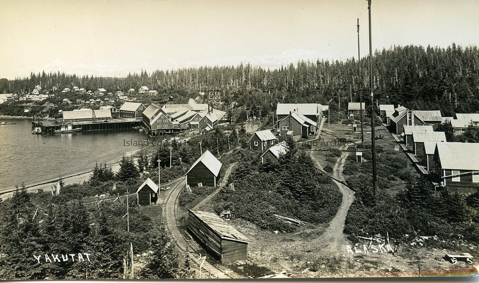 A photo of the the town Yakutat, Alaska, 1942. There is a train track, a number of wooden buildings, either telephone, telegraph or power lines on poles. A pier with a few boats, at least two water towers.