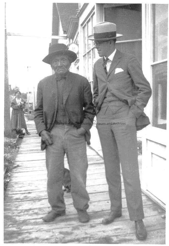 Chief Long Charlie Snaklin & George A. Kellogg standing on wooden sidewalk in Coupeville, Wash., 1923. Gookins girl in background (?).